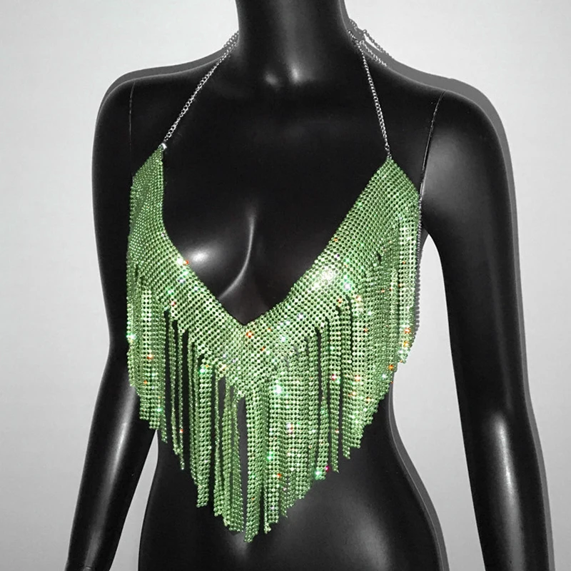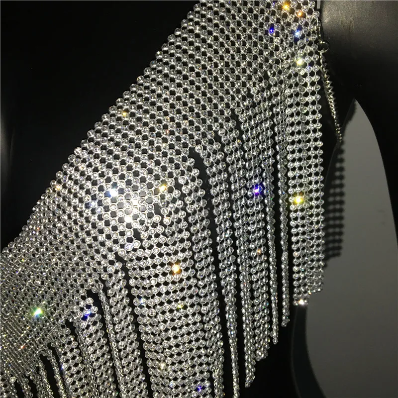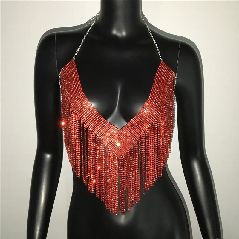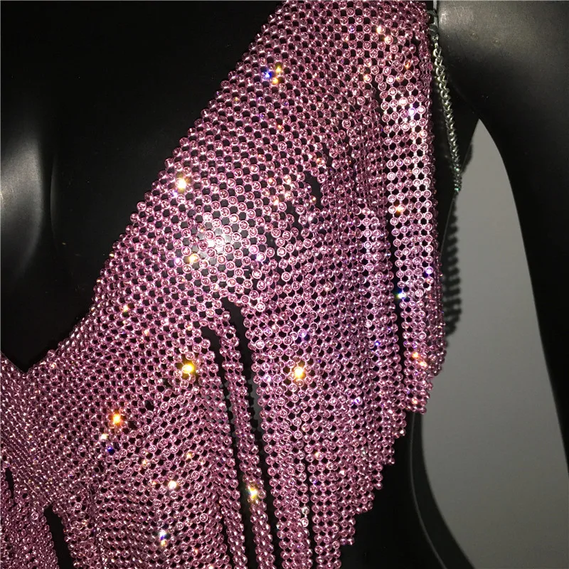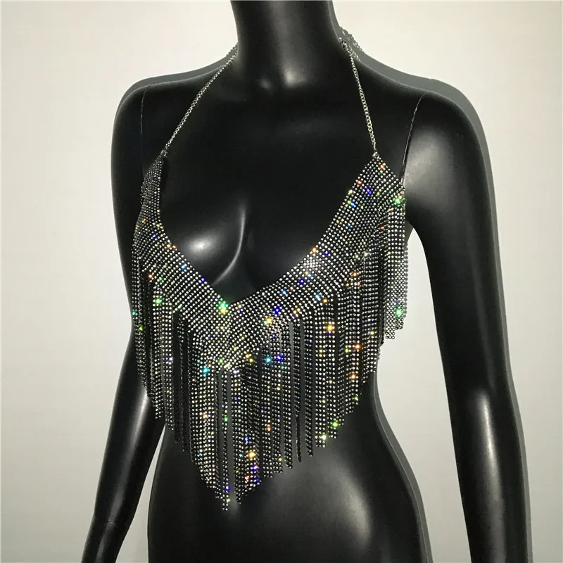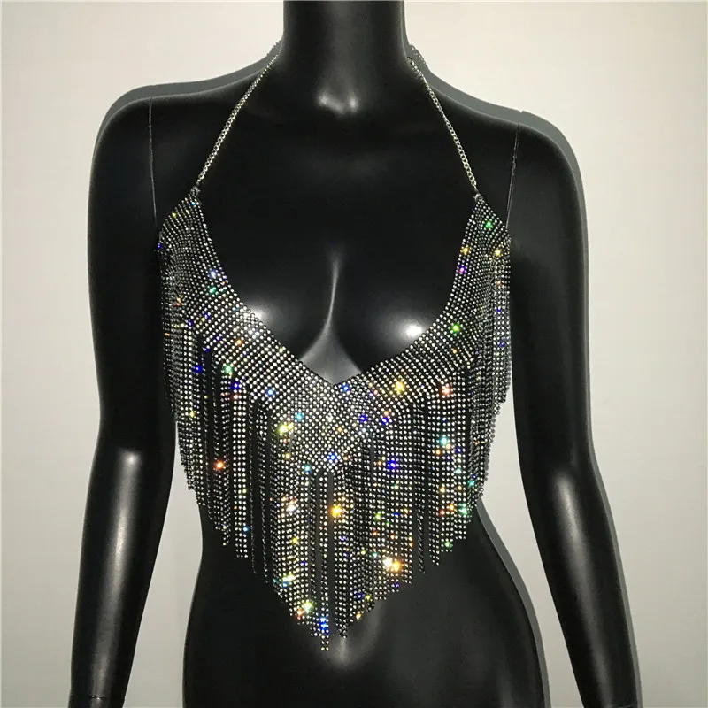 Bling Rhinestones Tassel Party Crop Top Woman Fashion Halter Neck Backless Design Full Diamond Sequins Party Clubwear
