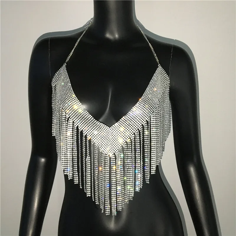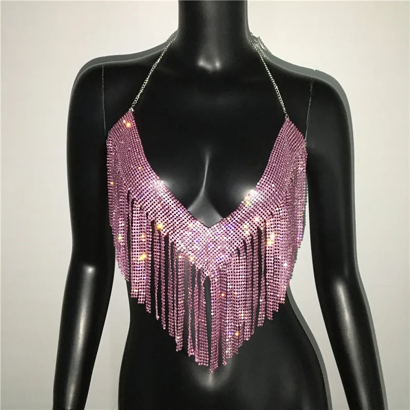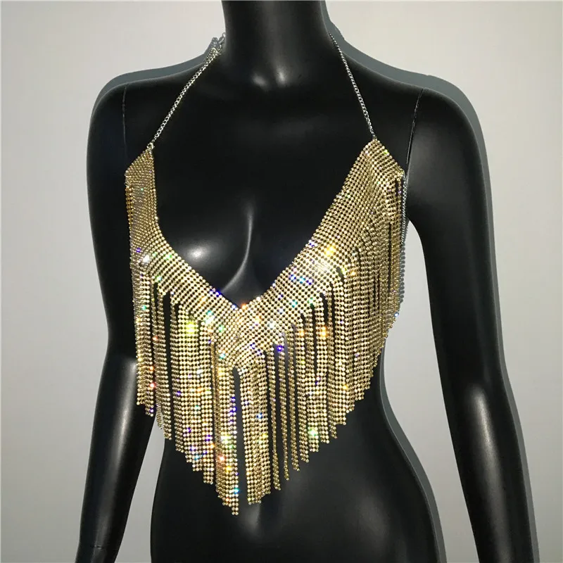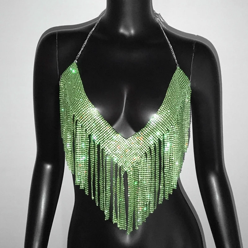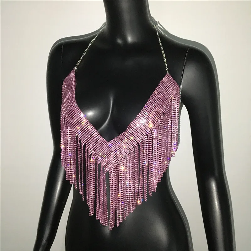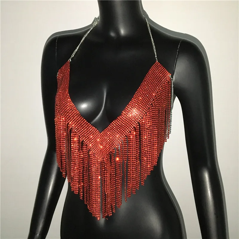Bling Rhinestones Tassel Party Crop Top Woman Fashion Halter Neck Backless Design Full Diamond Sequins Party Clubwear