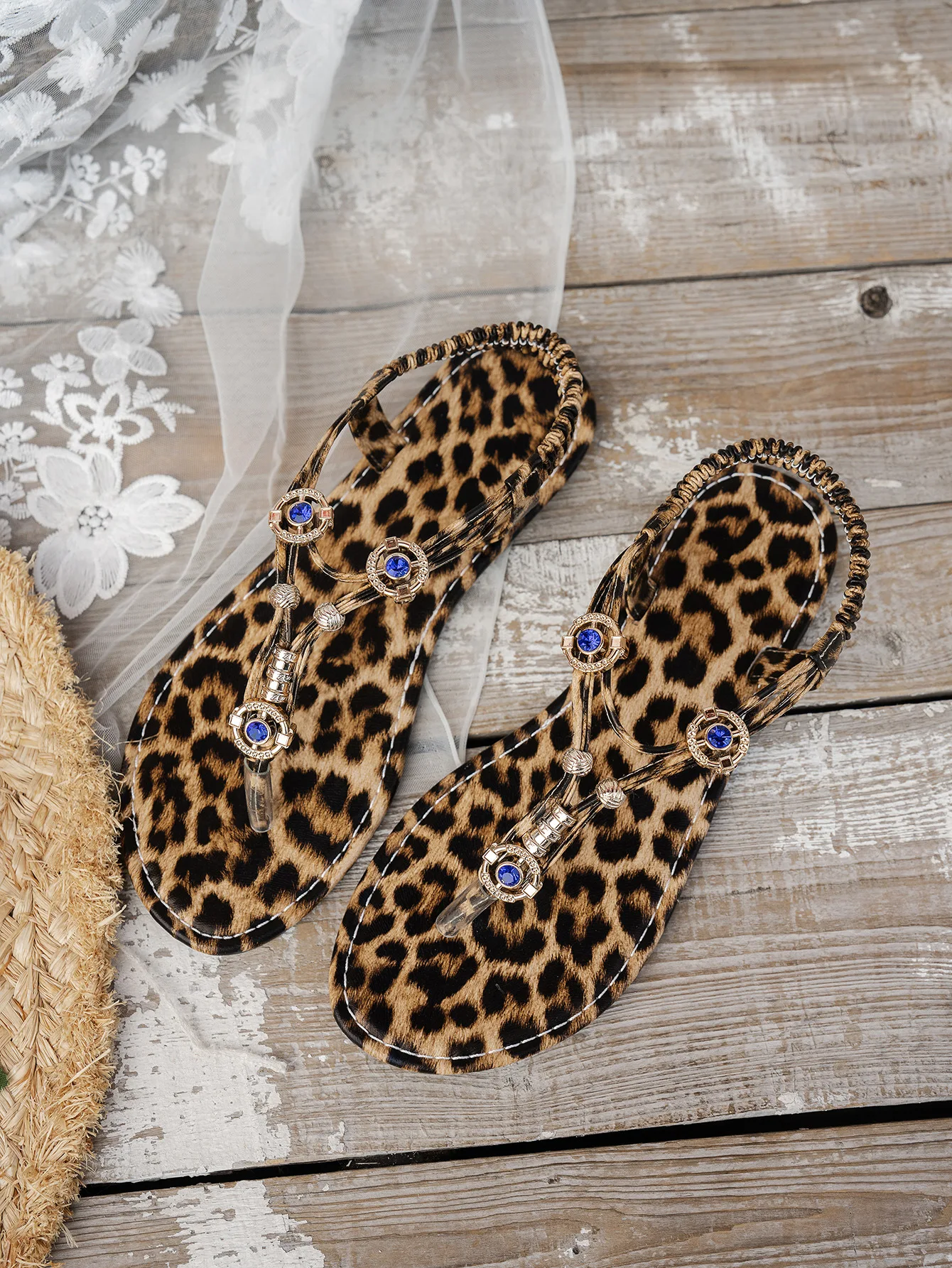 Fashion Sexy Leopard Printed Women’s Plus Size Sandals Round Toe Boho Wind Rhinestone Beaded Soft Sole Flat Sandals