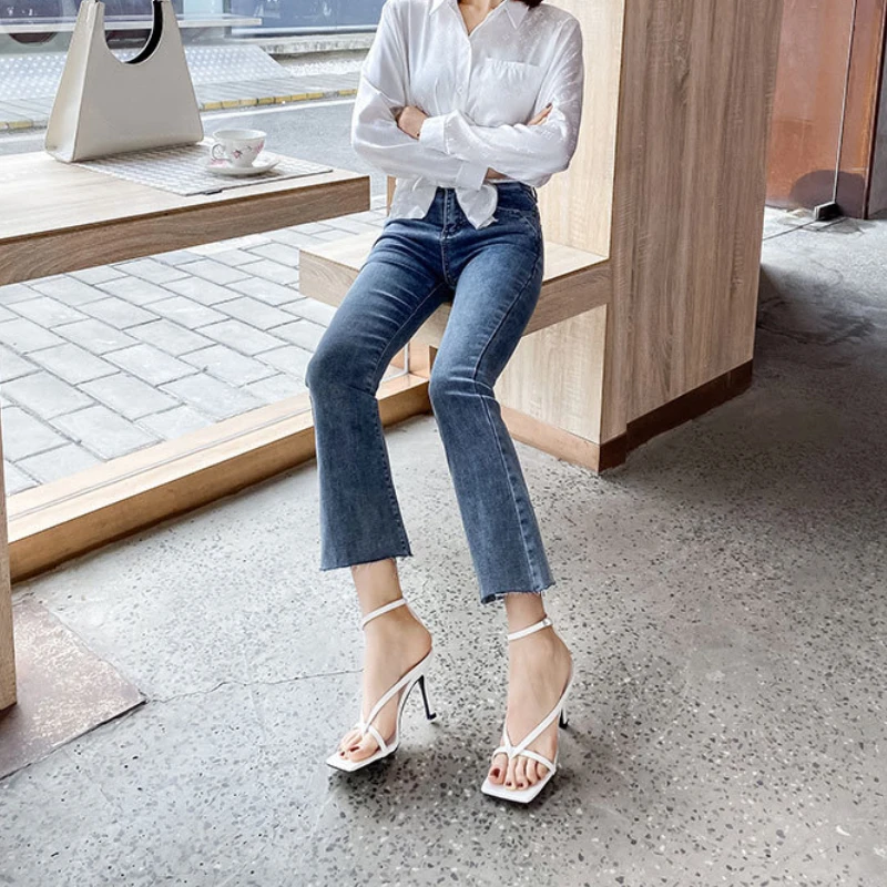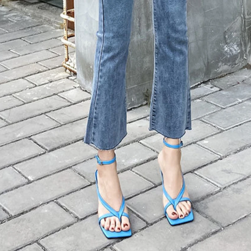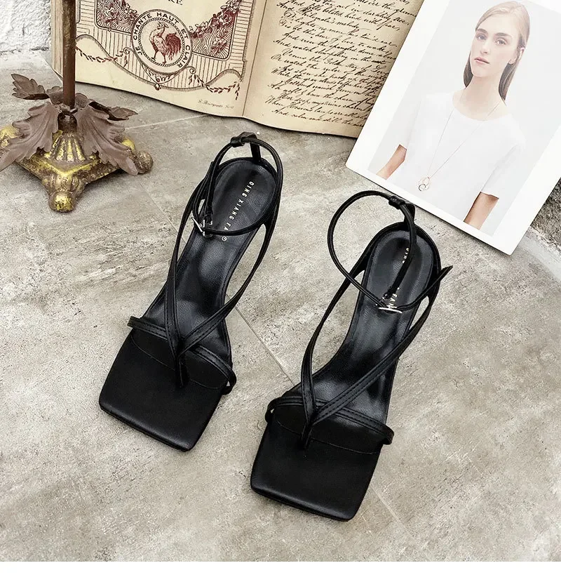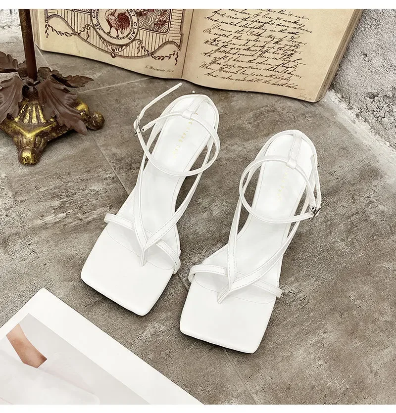 New Fashion Pinch Narrow Band Women Sandals 2025 Summer Square Open Toe Ankle Buckle Strap High Heels Ladies Shoes