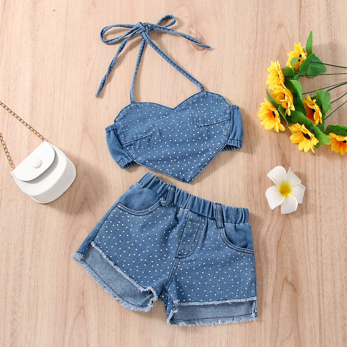 Toddler Girl Summer Clothes 2Pcs Outfits, Dot Print Heart Denim Camisole + Ripped Jeans Shorts