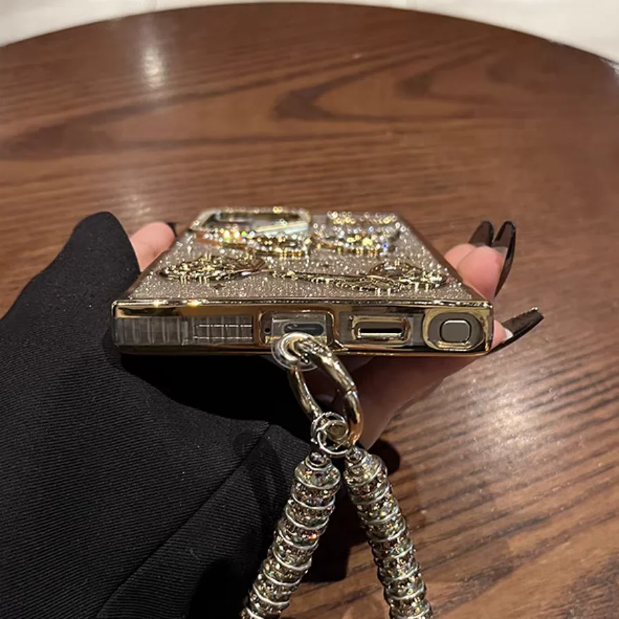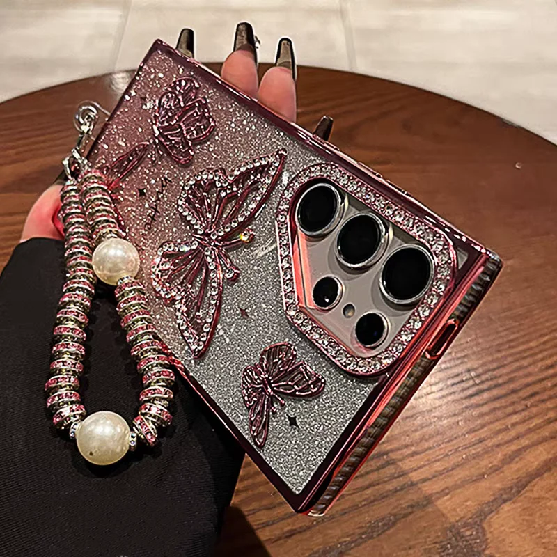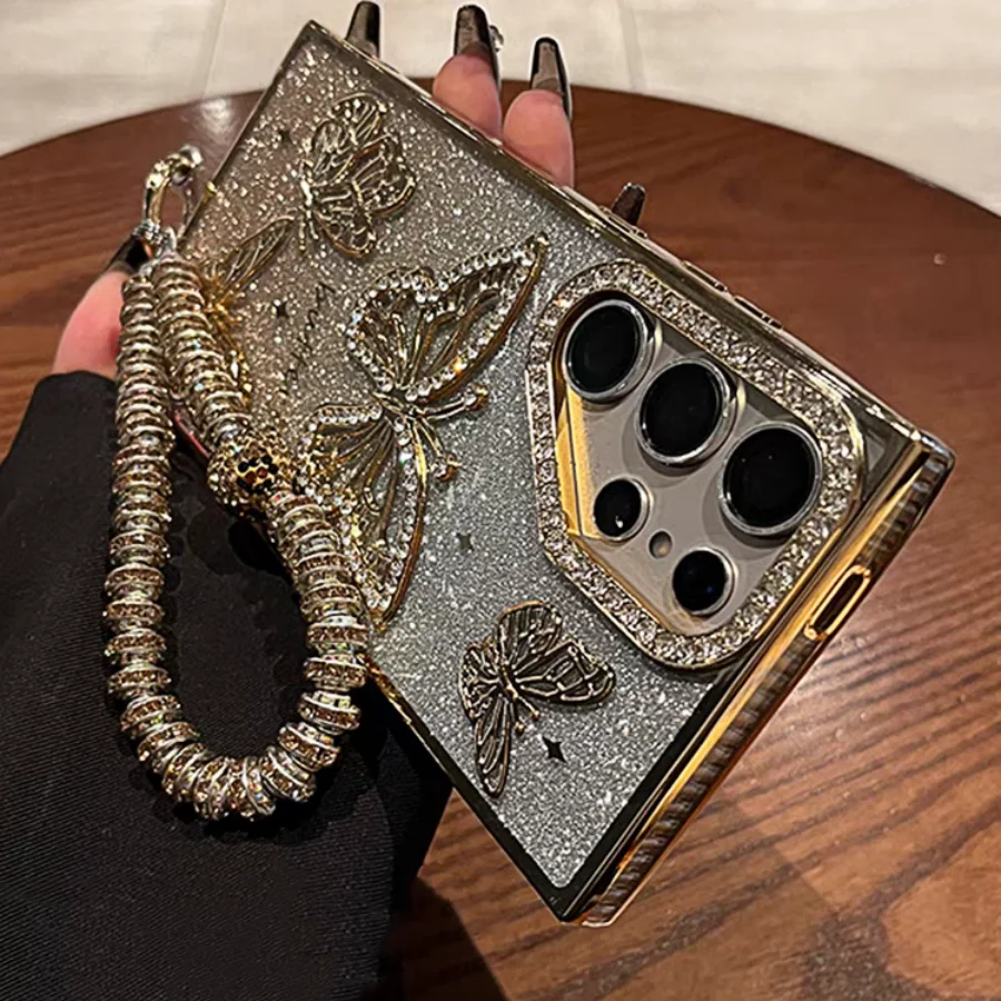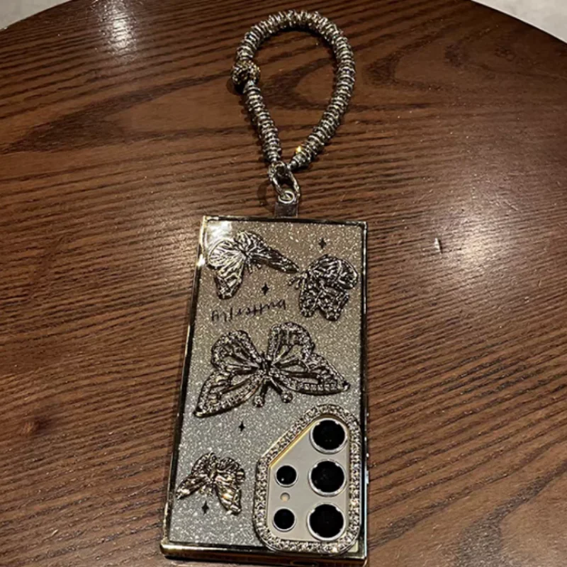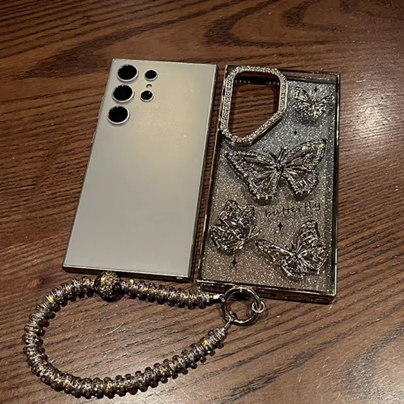 Glitter Butterfly Cases For Samsung S25 Ultra Luxury Hand Lanyard Cover For Galaxy S24Ultra S23 FE Plating Soft Anti-drop Case