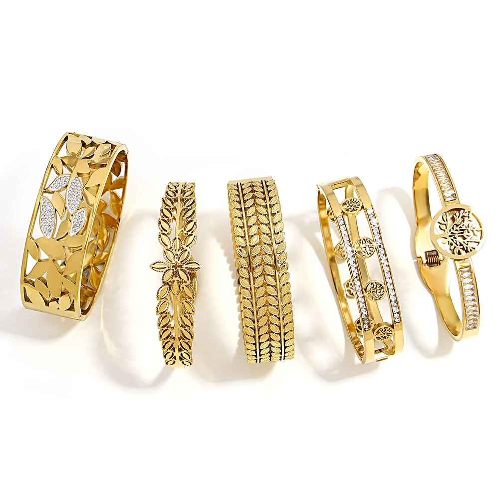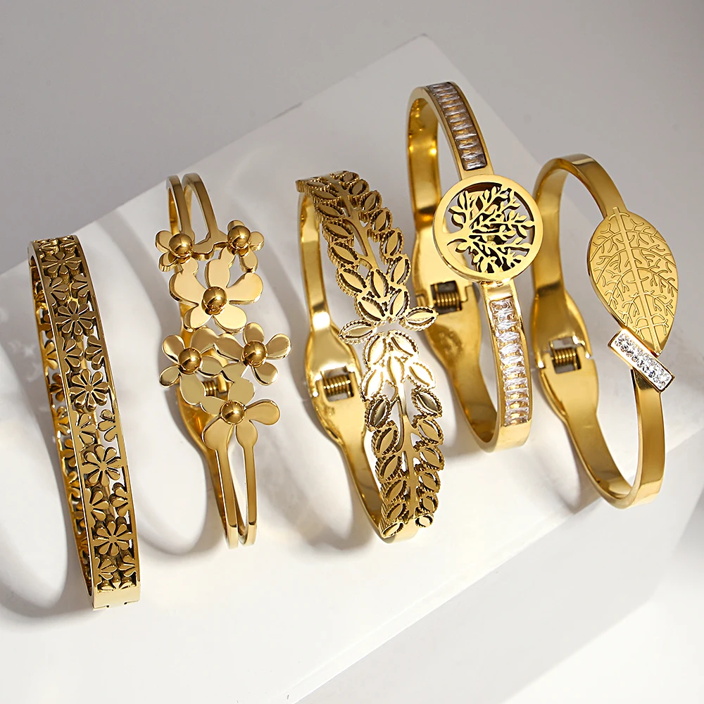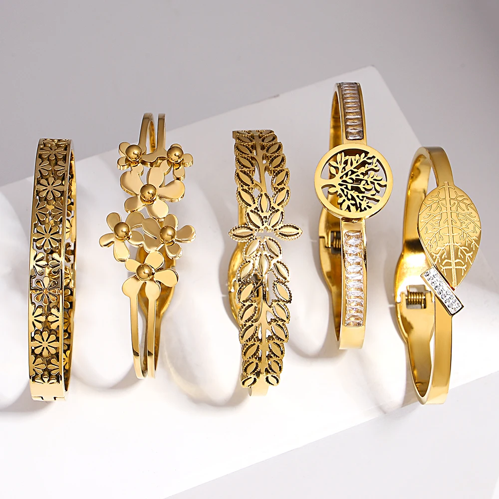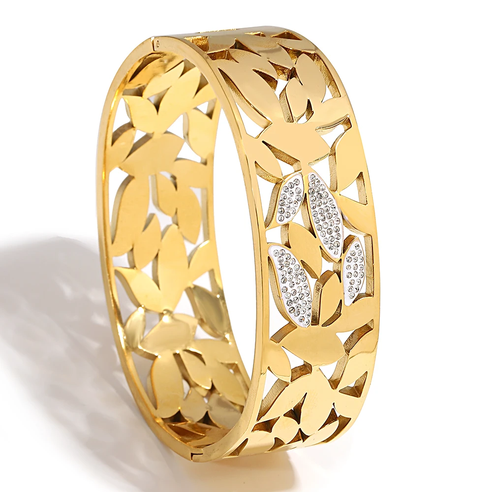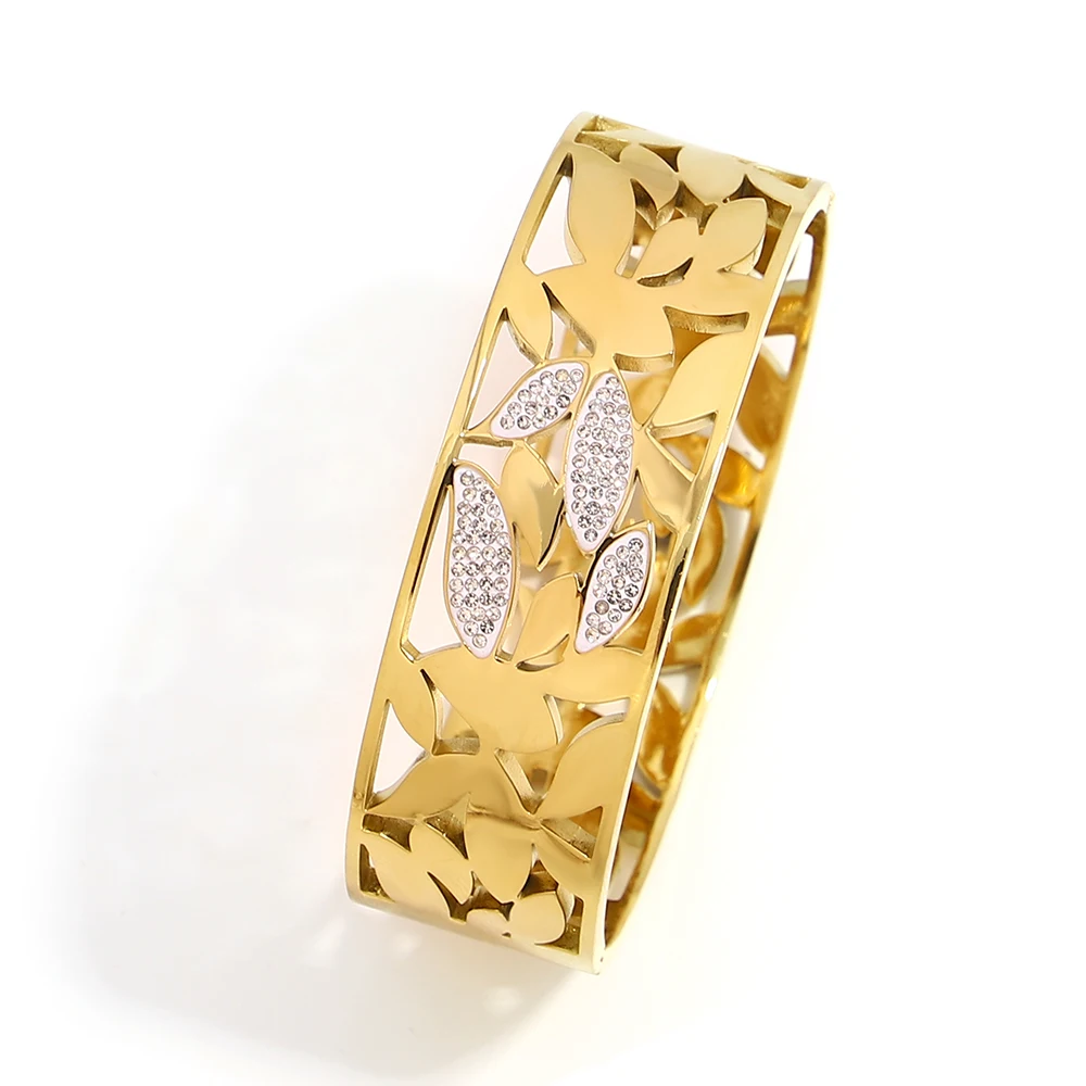 Greatera Irregular Hollow Leaf Flower Decoration Stainless Steel Opens Bracelet For Women Men Cubic Zircon Filled Luxury Bangle