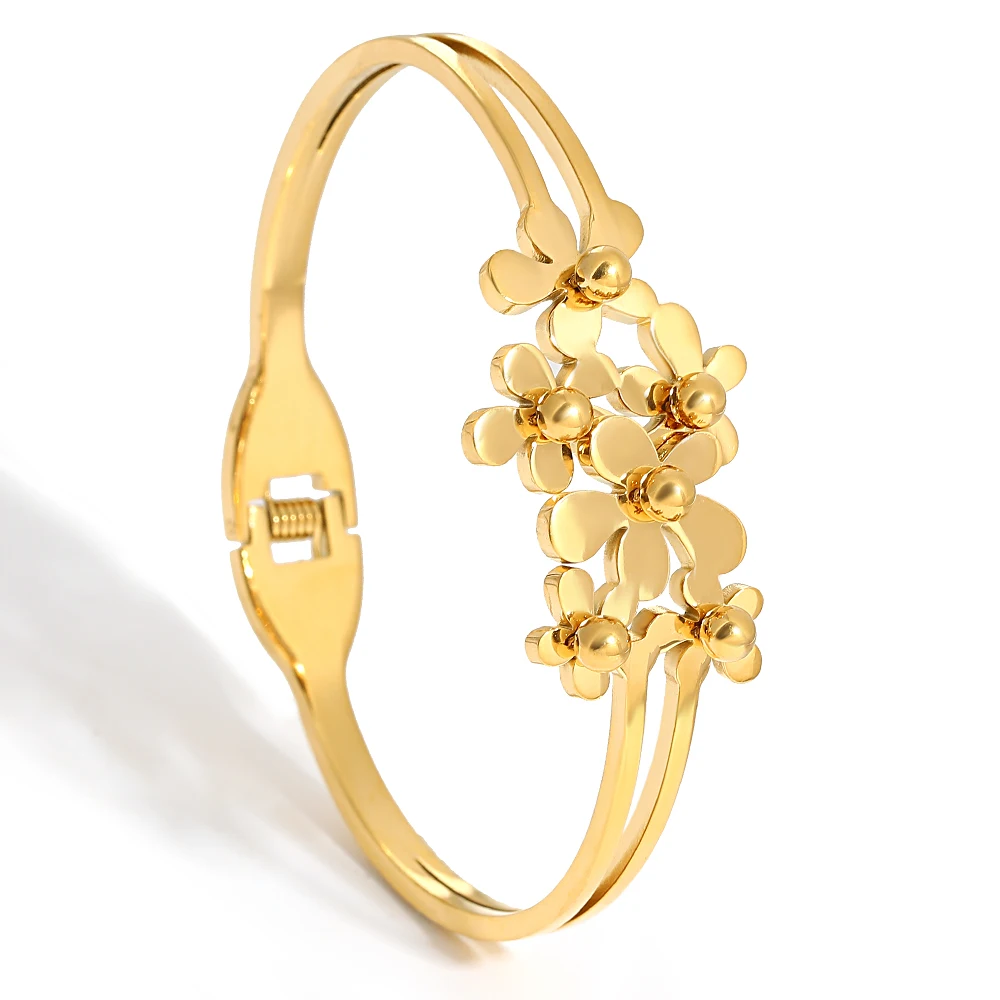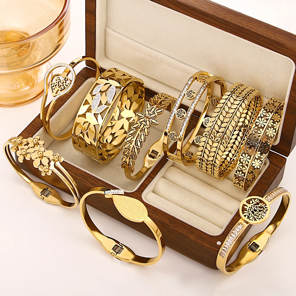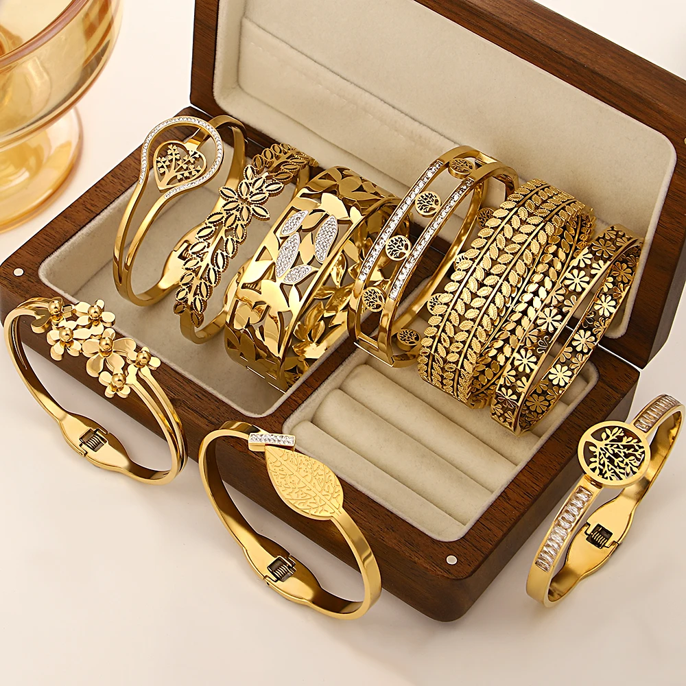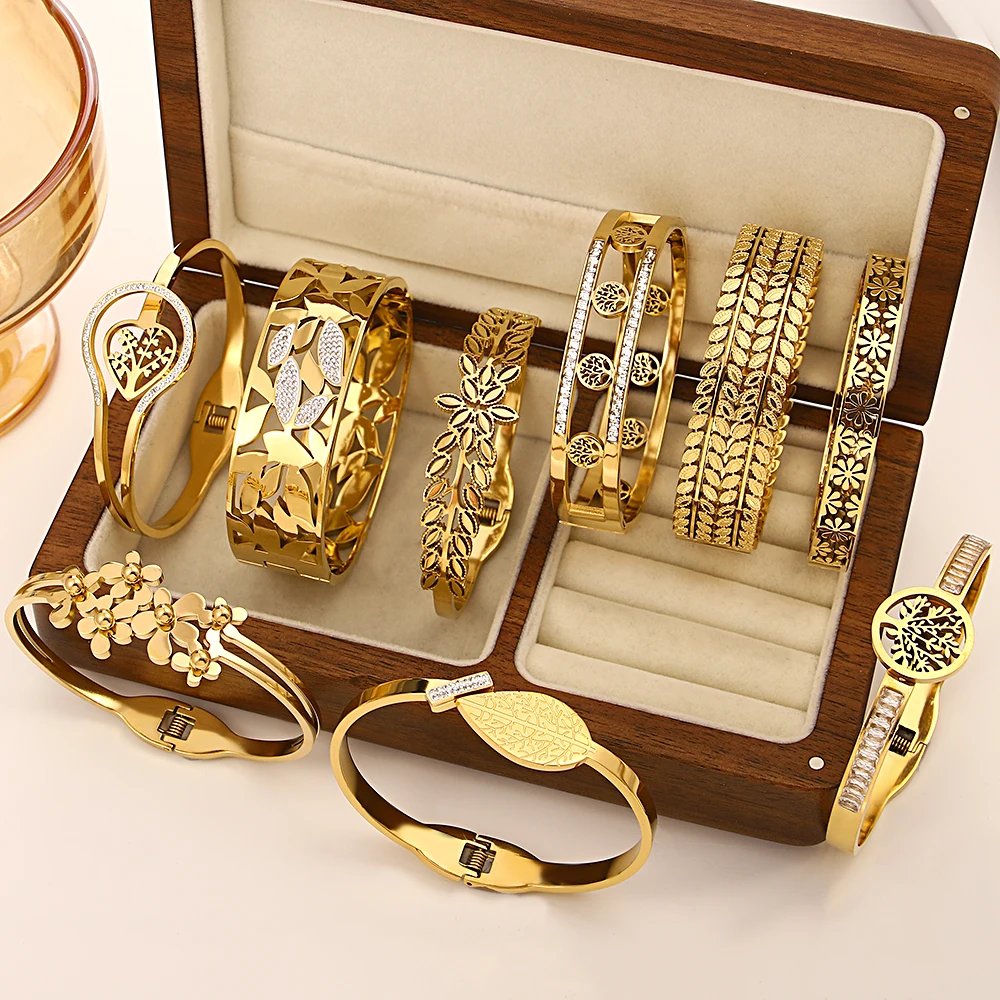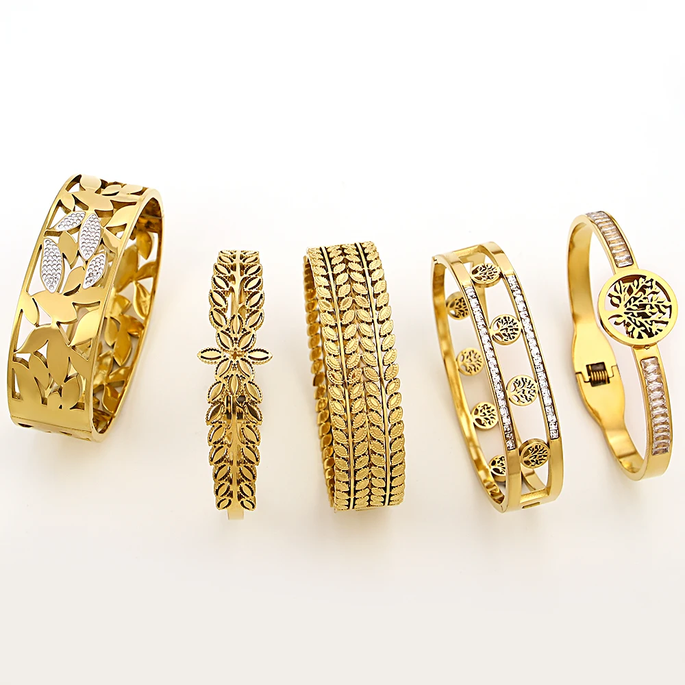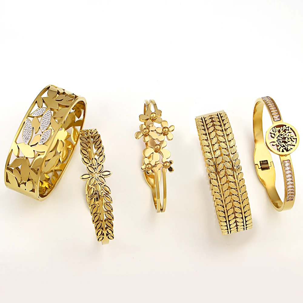 Greatera Irregular Hollow Leaf Flower Decoration Stainless Steel Opens Bracelet For Women Men Cubic Zircon Filled Luxury Bangle