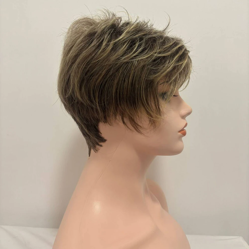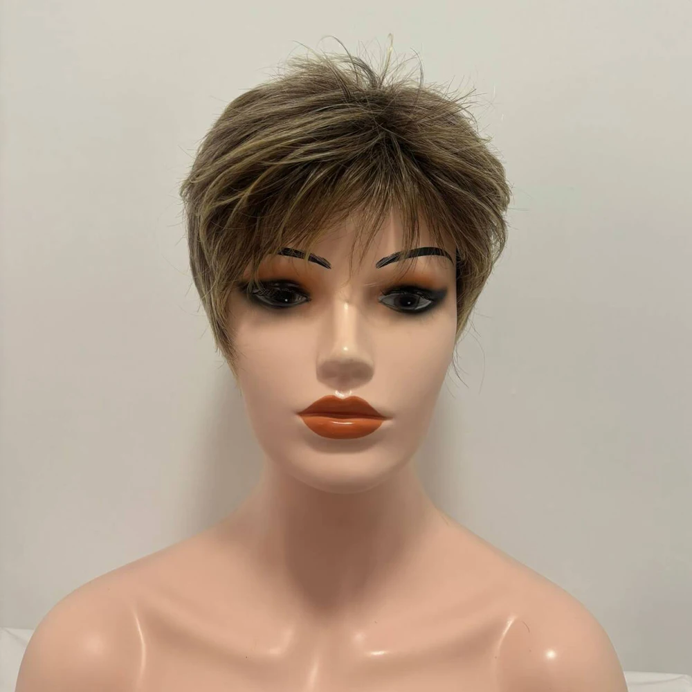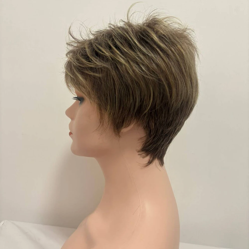 Short Dark Brown Mixed Blonde Highlight Pixie Cut Wigs with Bangs Synthetic Layered Wigs for Women Natural Hair Replacement Wigs