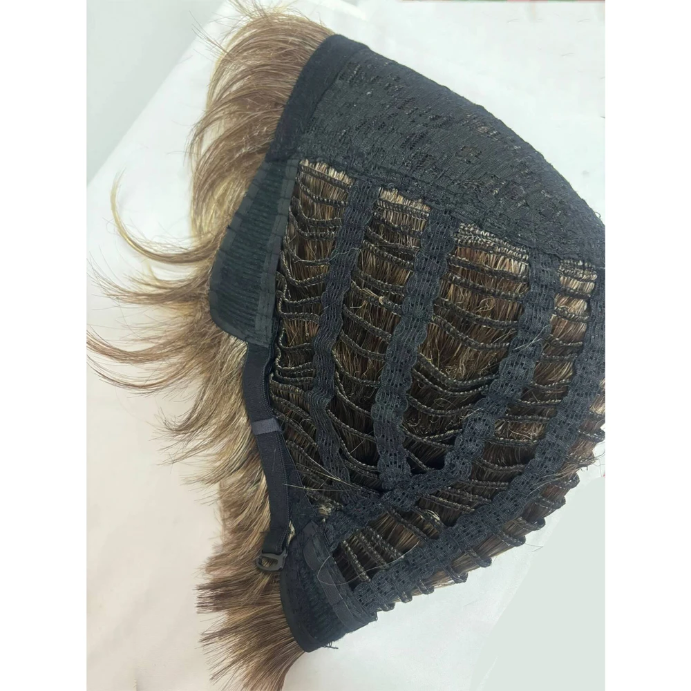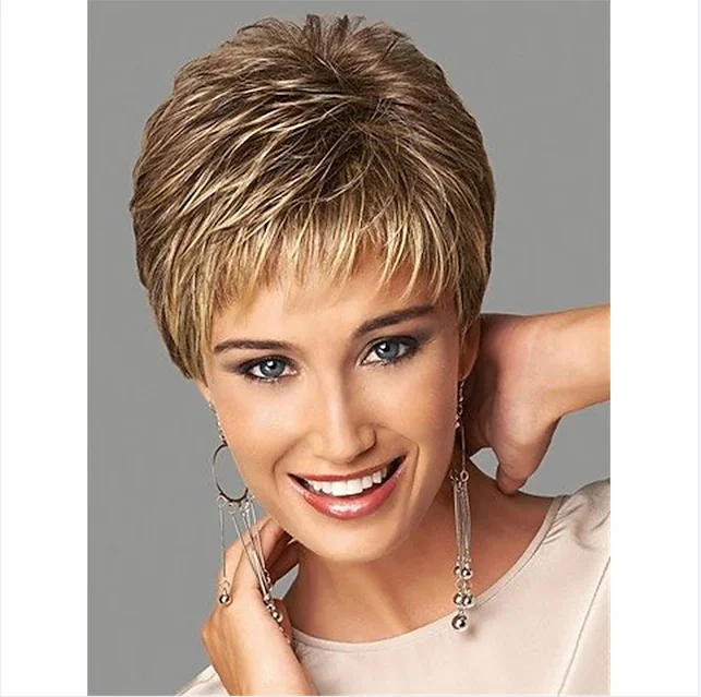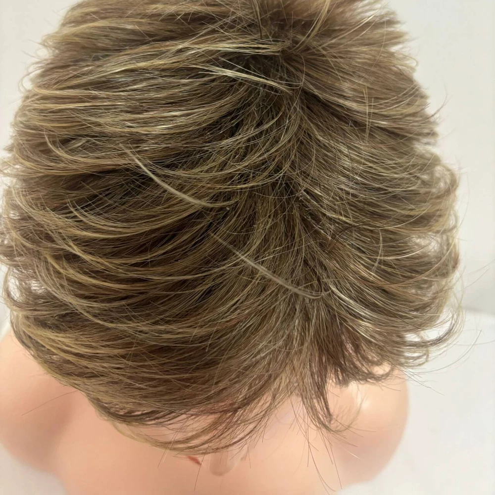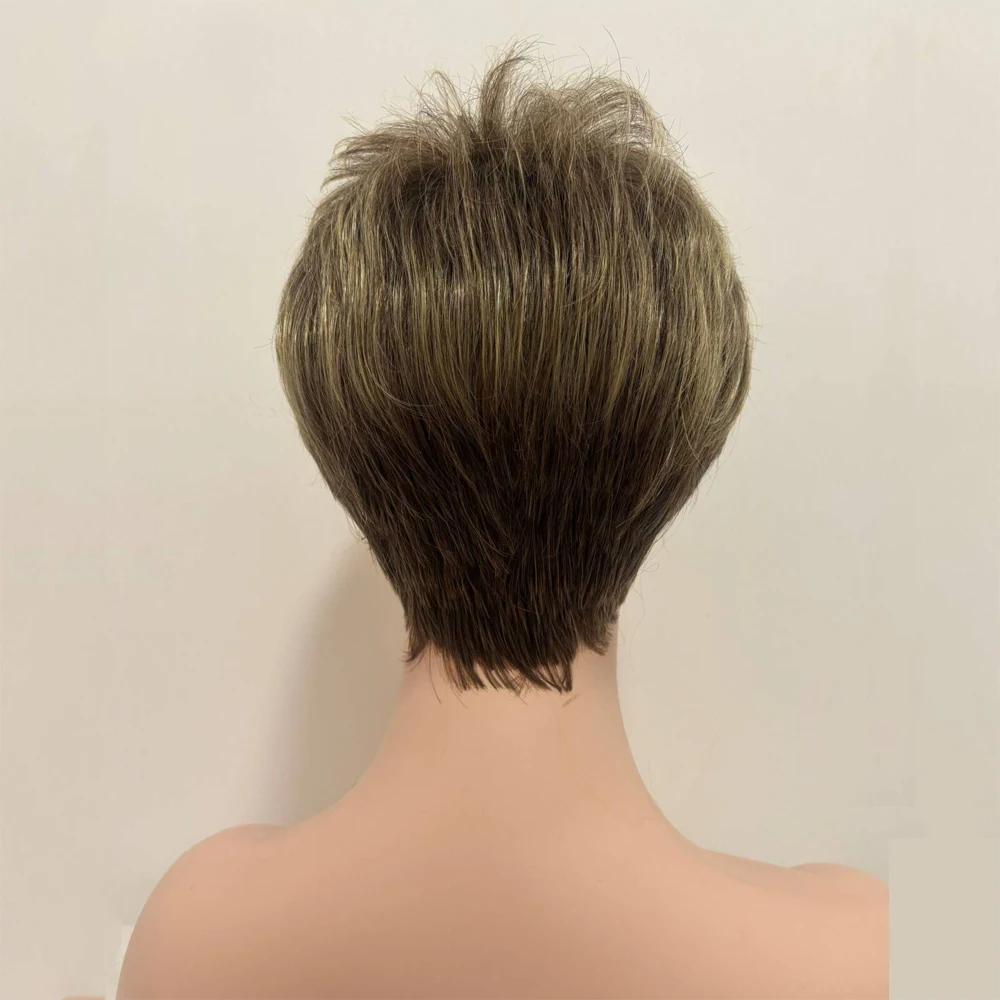 Short Dark Brown Mixed Blonde Highlight Pixie Cut Wigs with Bangs Synthetic Layered Wigs for Women Natural Hair Replacement Wigs