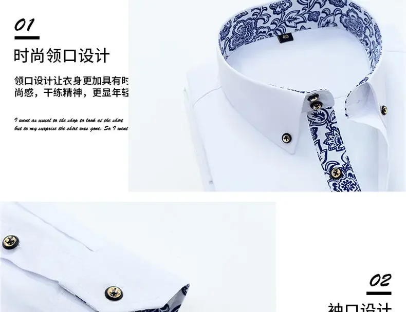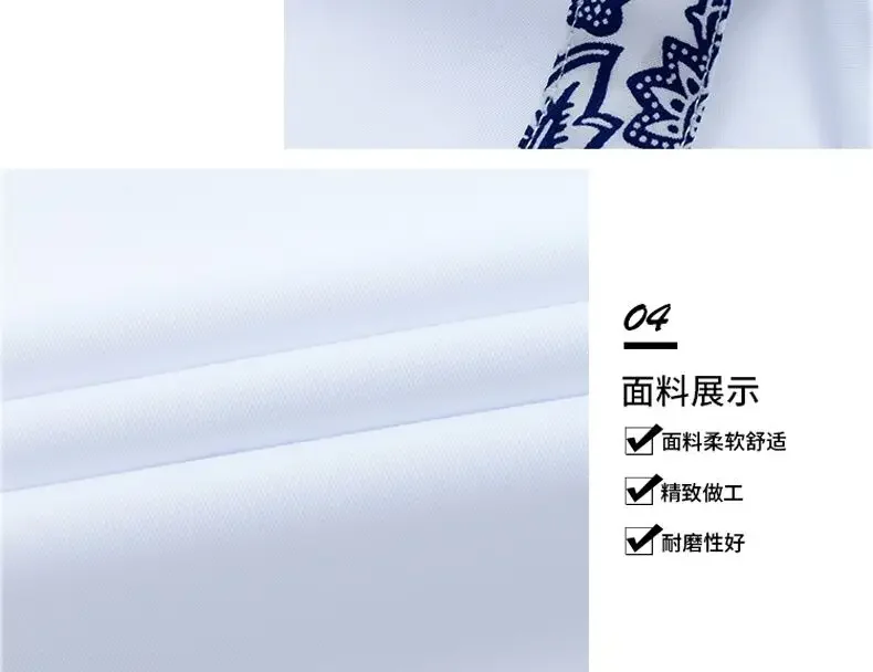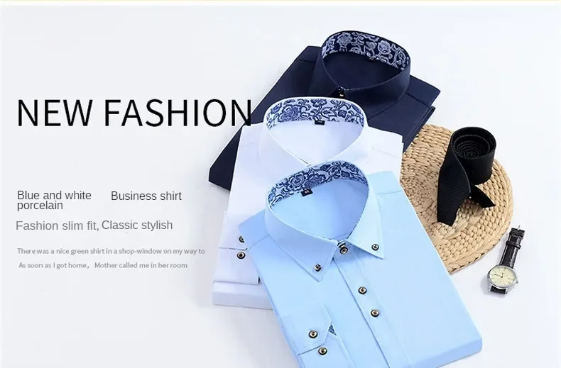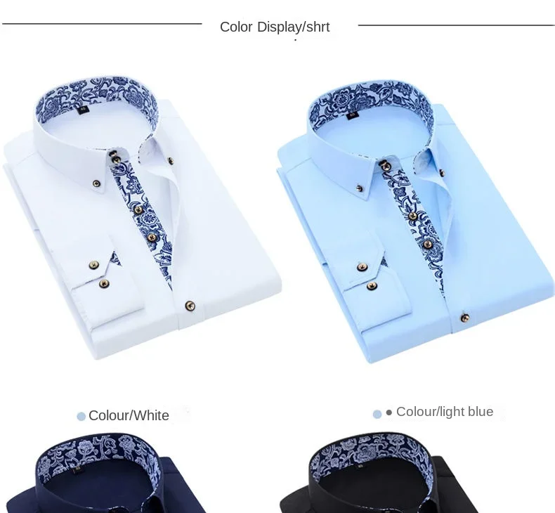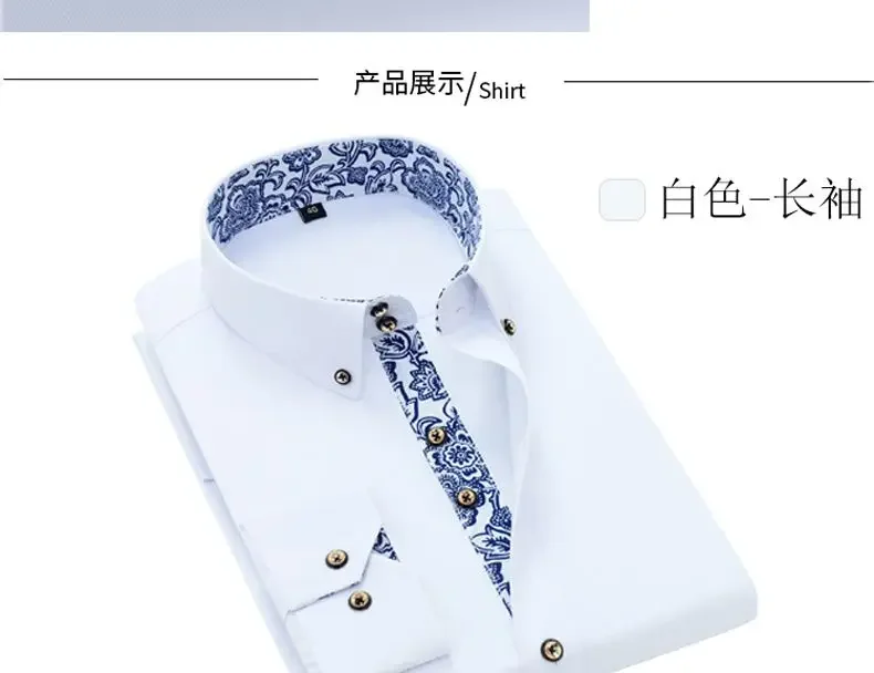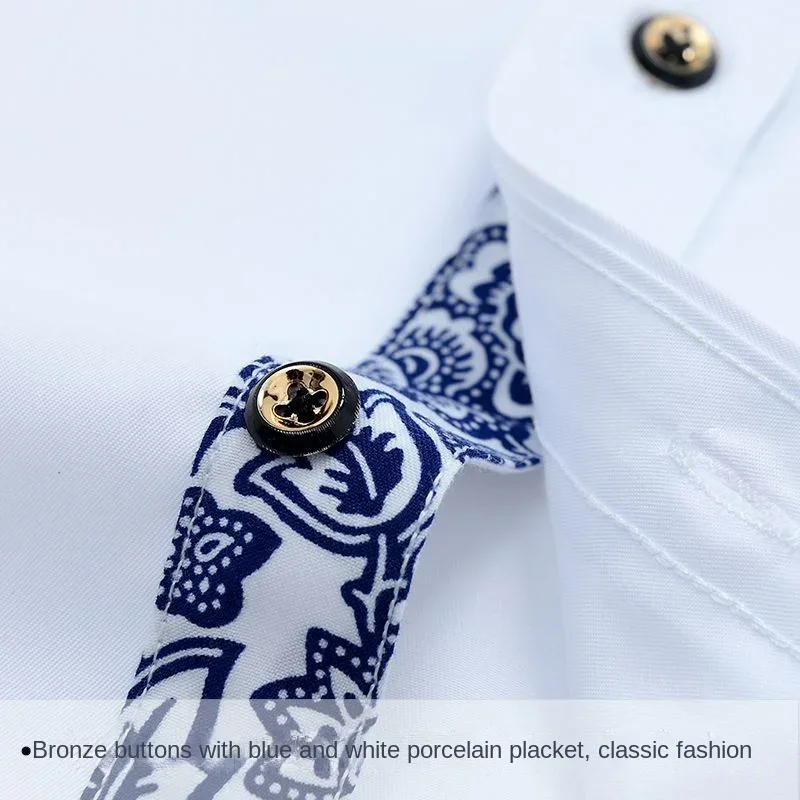 High-end Cotton Men’s Long-sleeved Shirts – Retro Blue and White Porcelain Collar Style Business Casual Shirt White Black Blue