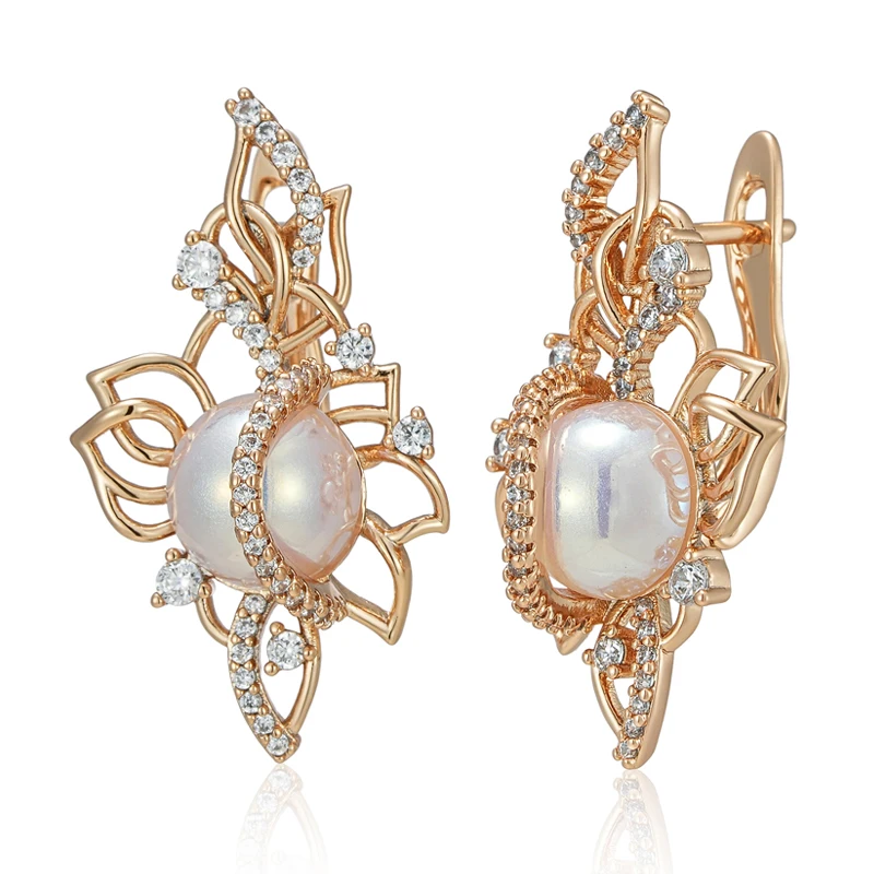 Kinel Luxury 585 Rose Gold Drop Earrings for Women Unique Geometric Hollow Bridal Accessories Natural Zircon Pearl Jewelry Gift