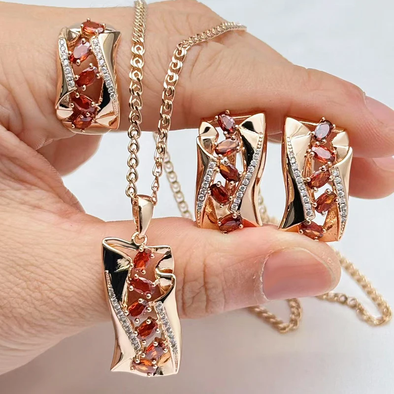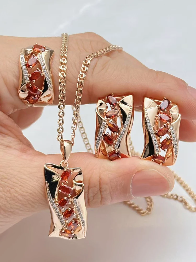 Kinel Shiny Red Natural Zircon Jewelry Set for Woman Fashion 585 Rose Gold Color Ring Earrings Necklace 3Pcs Vintage Jewelry Set