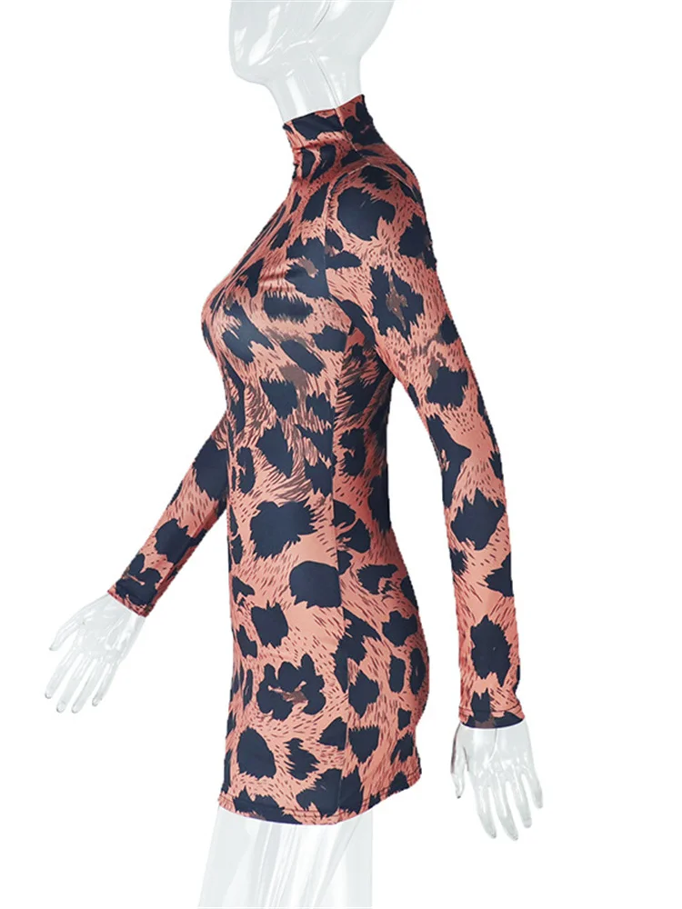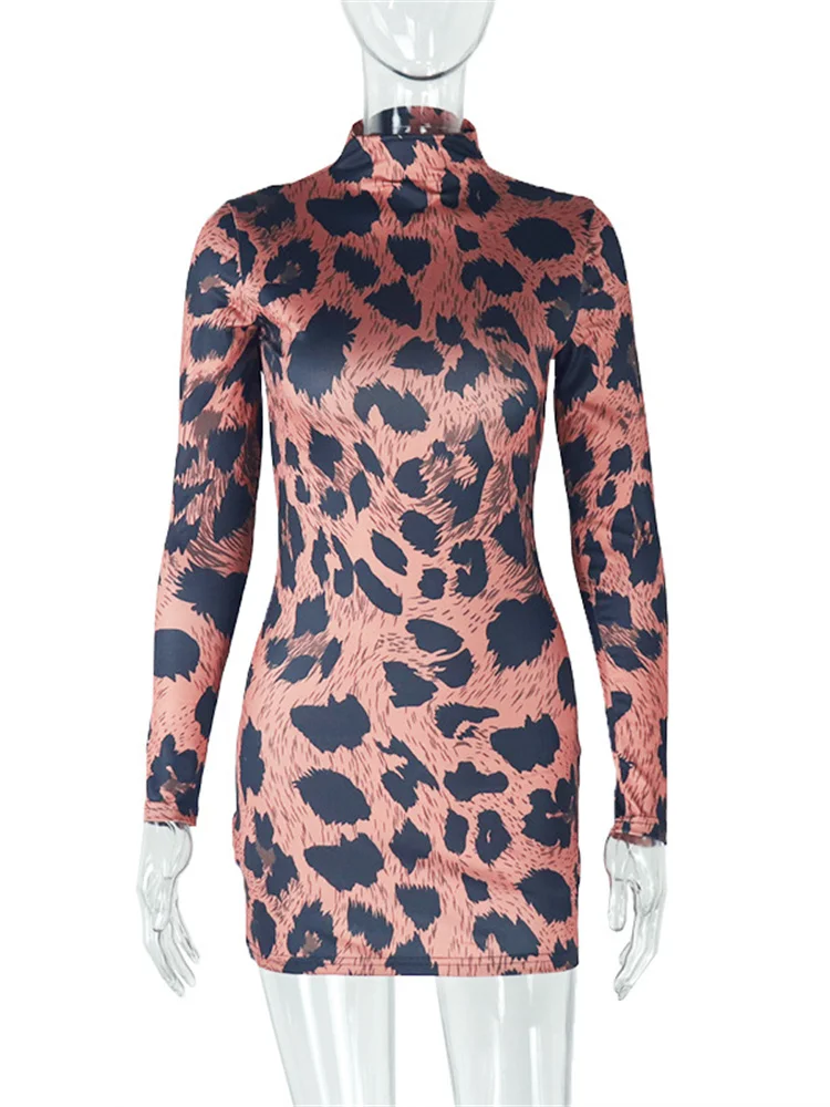 kliou Leopard Popular Women Mini Dress Hipster New Full Sleeve Stand Collar Skinny Y2K Bodycon Mujer Vintage Classic Party Frock