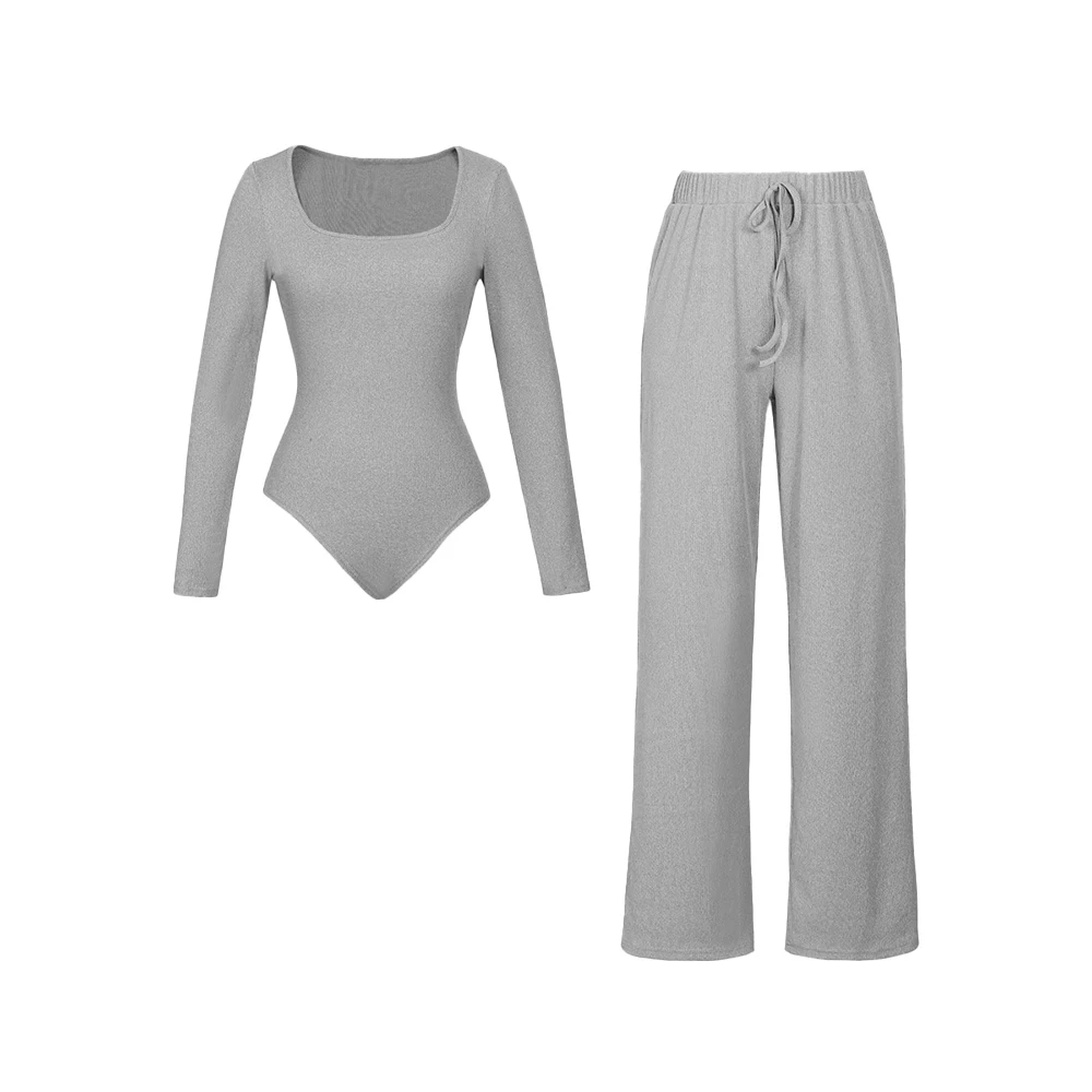 Ladies Casual Two-Piece Suit round Neck Long Sleeve Top with Wide Leg Pants Pure Color Straight Loose Trousers Elegant Outfit