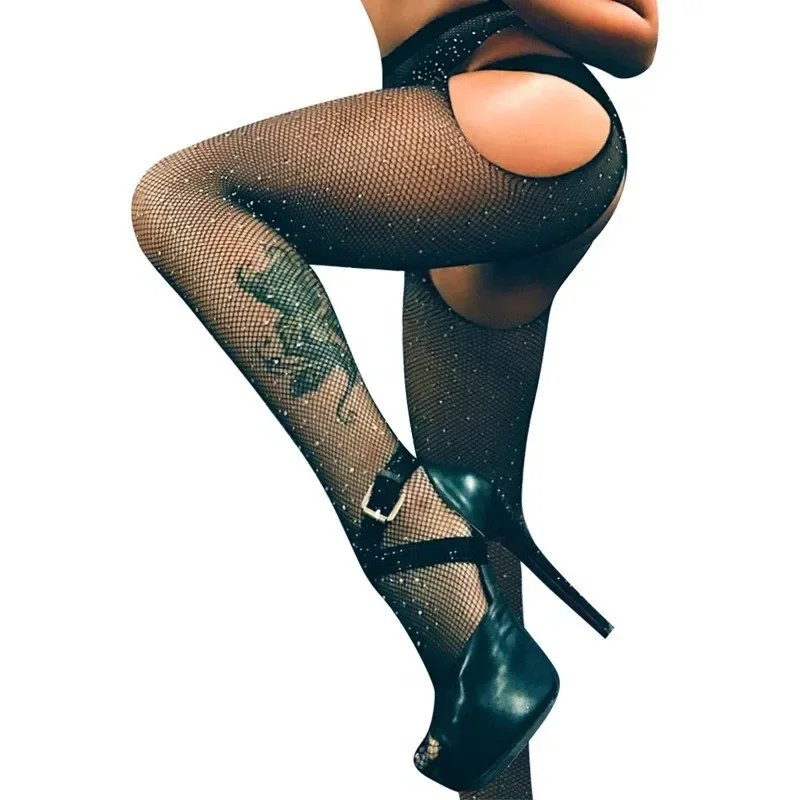 Large Size Hollow Out Mesh Stockings Women Crystal Crotchless Pantyhose Sexy Lingerie Shiny Sexy Tights Thigh High Stockings