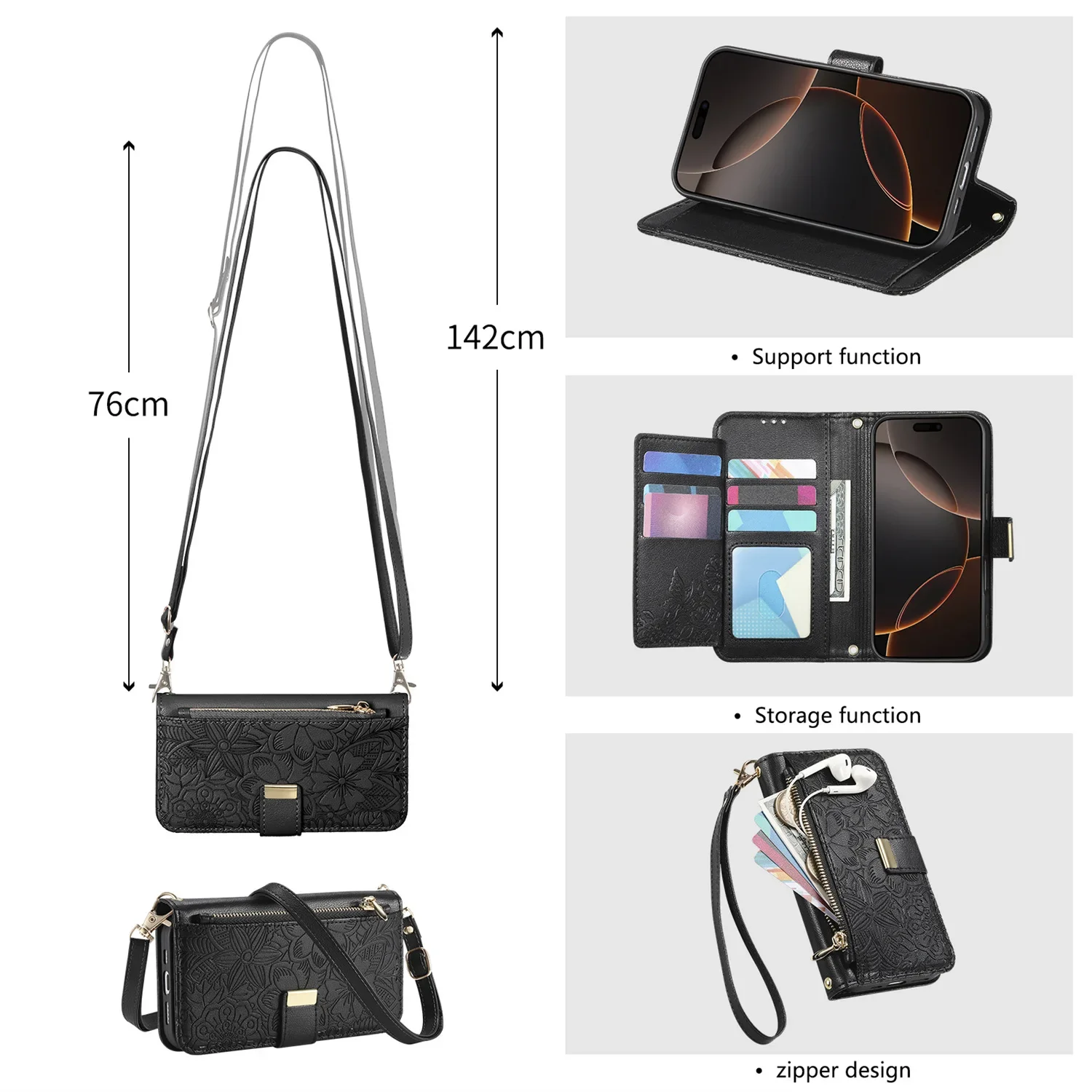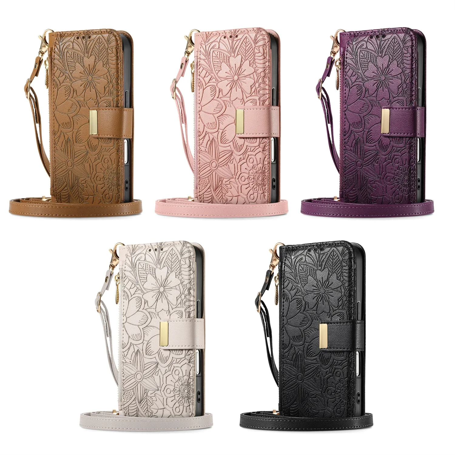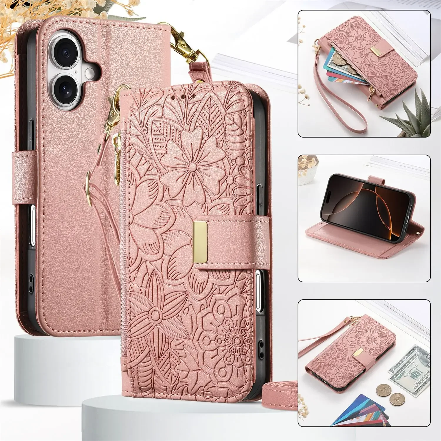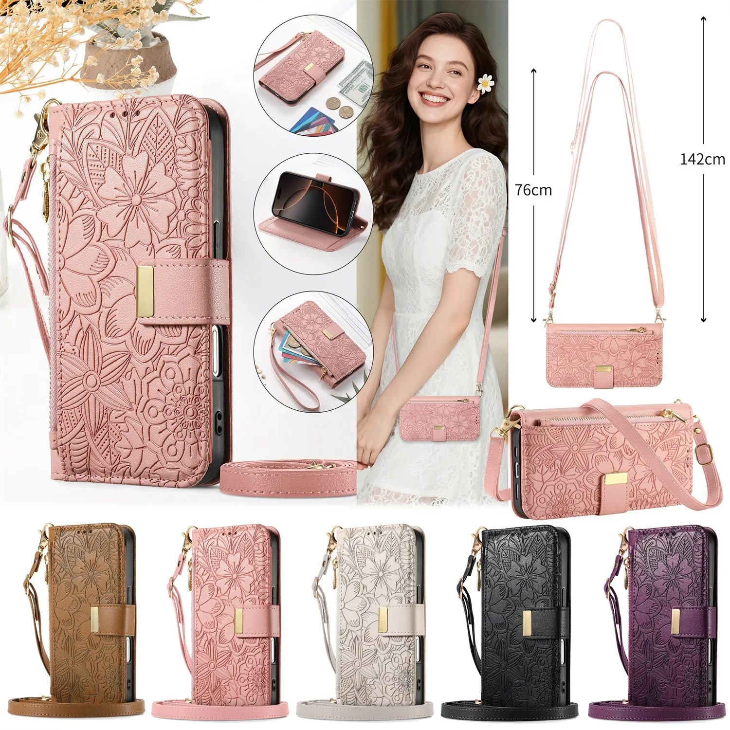 Zipper Crossbody Leather Flip Wallet Card Slot Phone Case for iPhone 16E 16 Plus 15 14 13 12 11 Pro Max Wrist strap Funda Cover