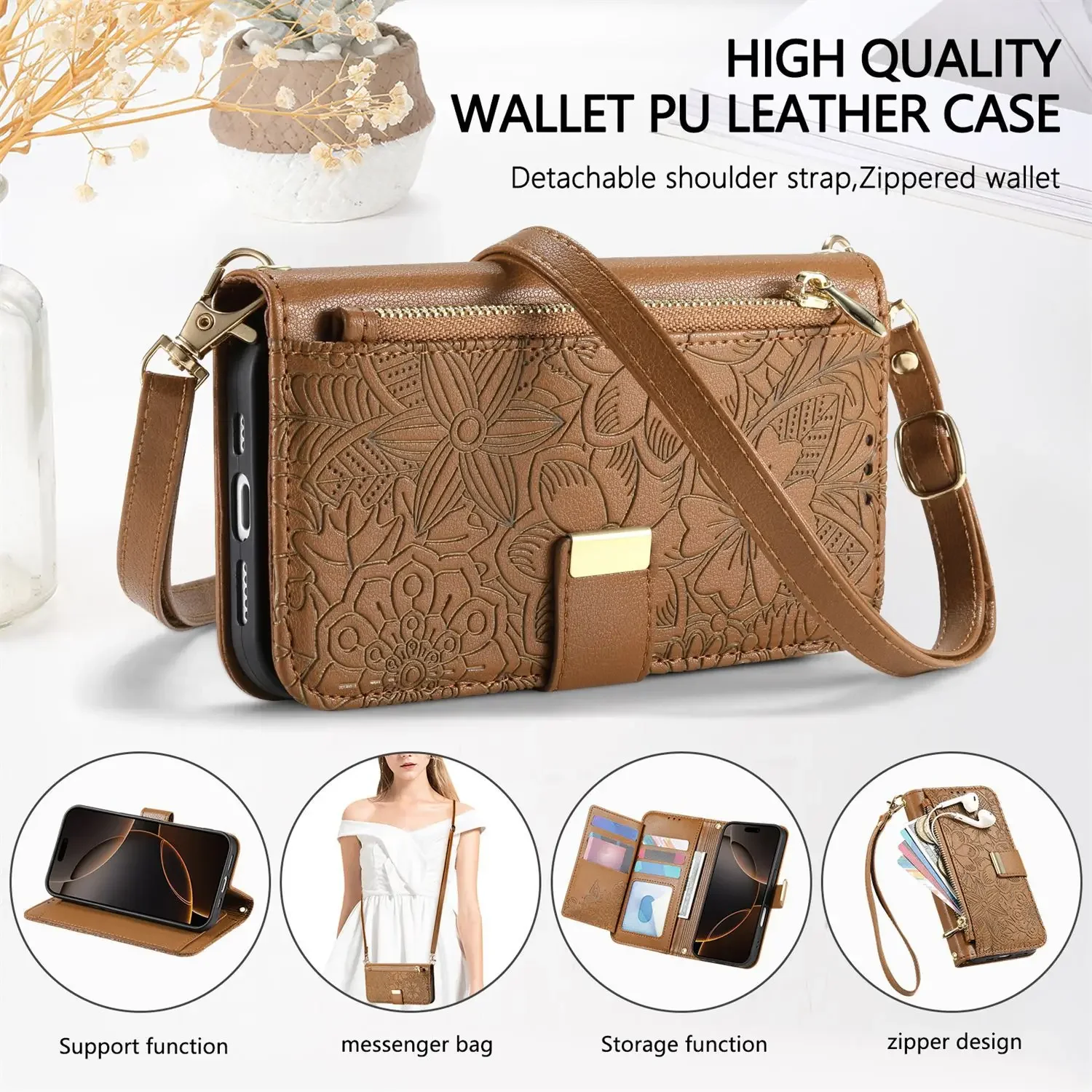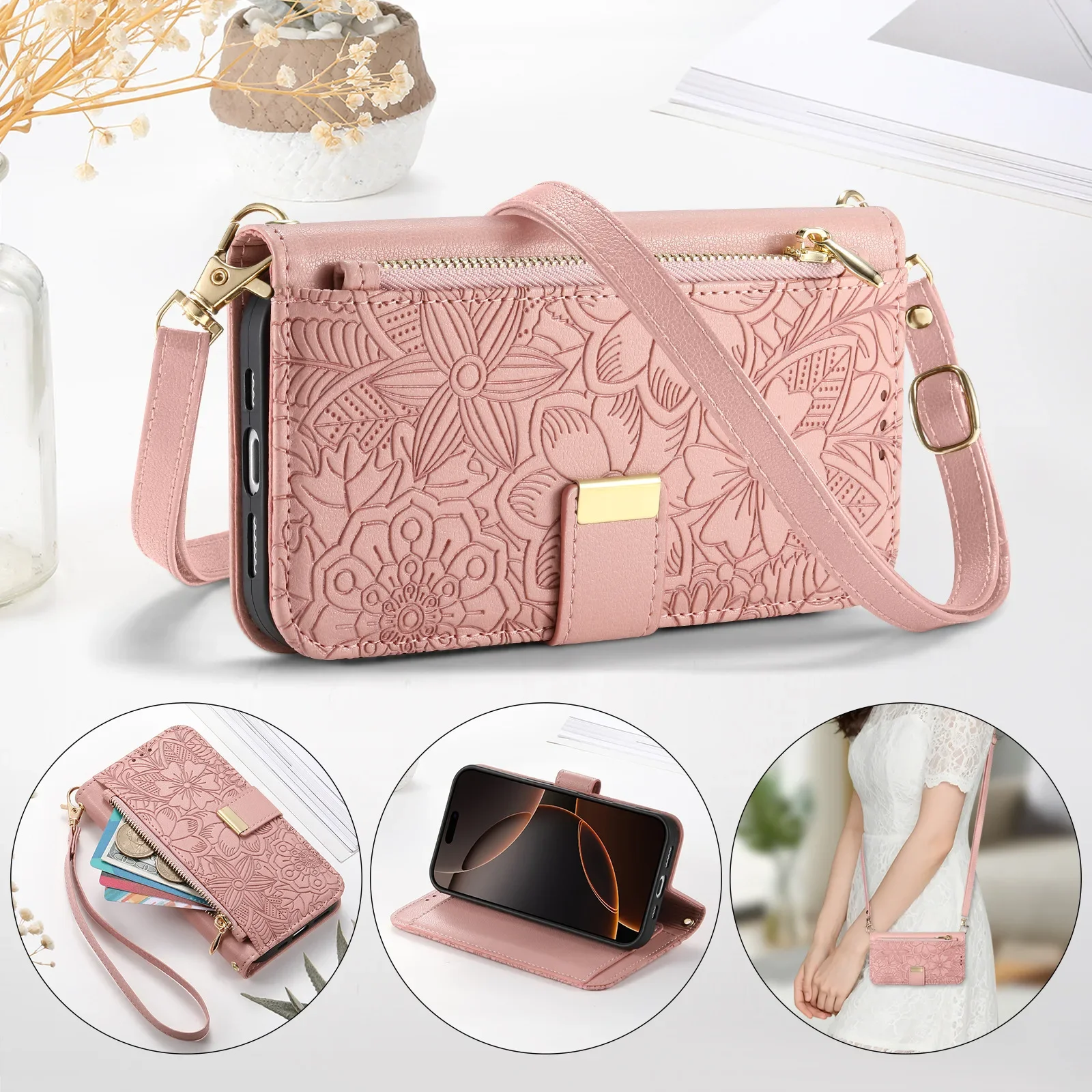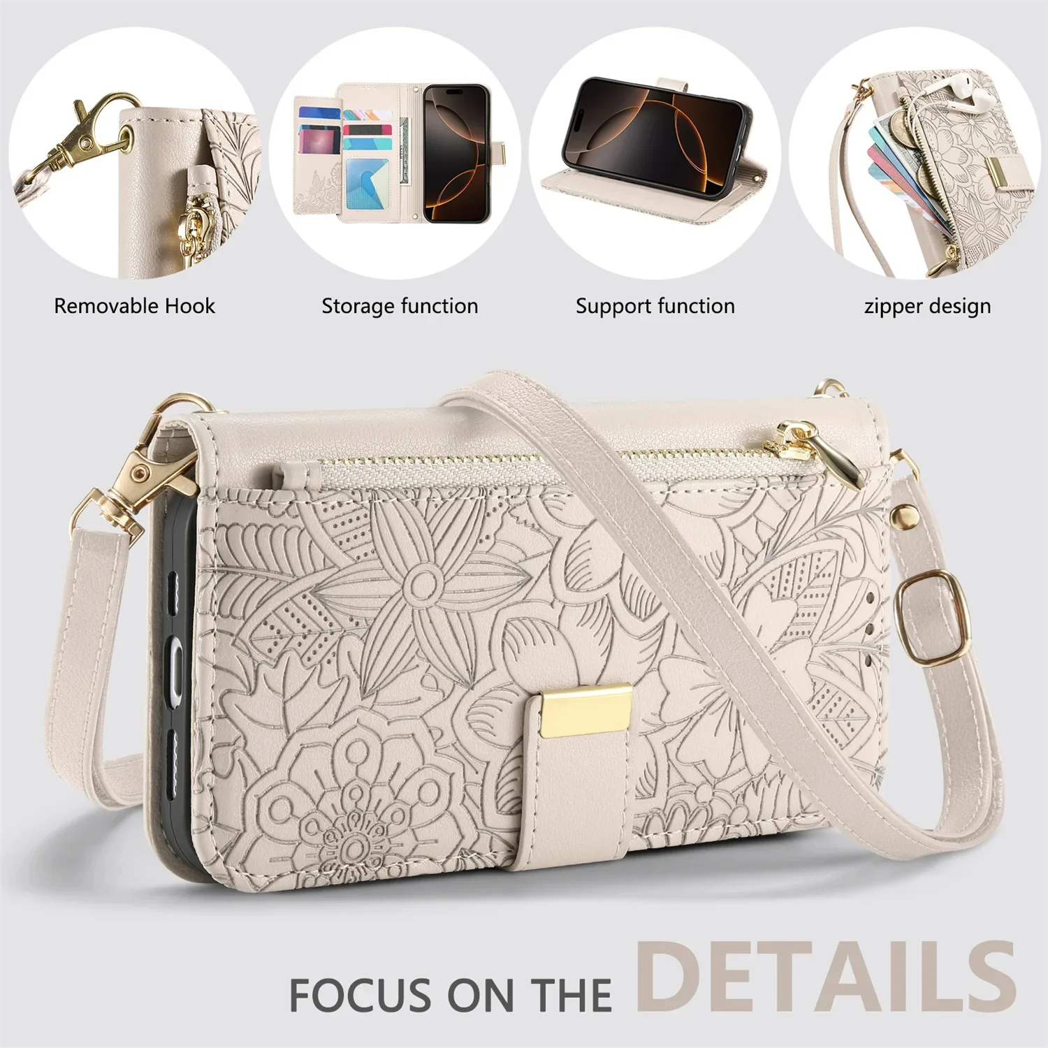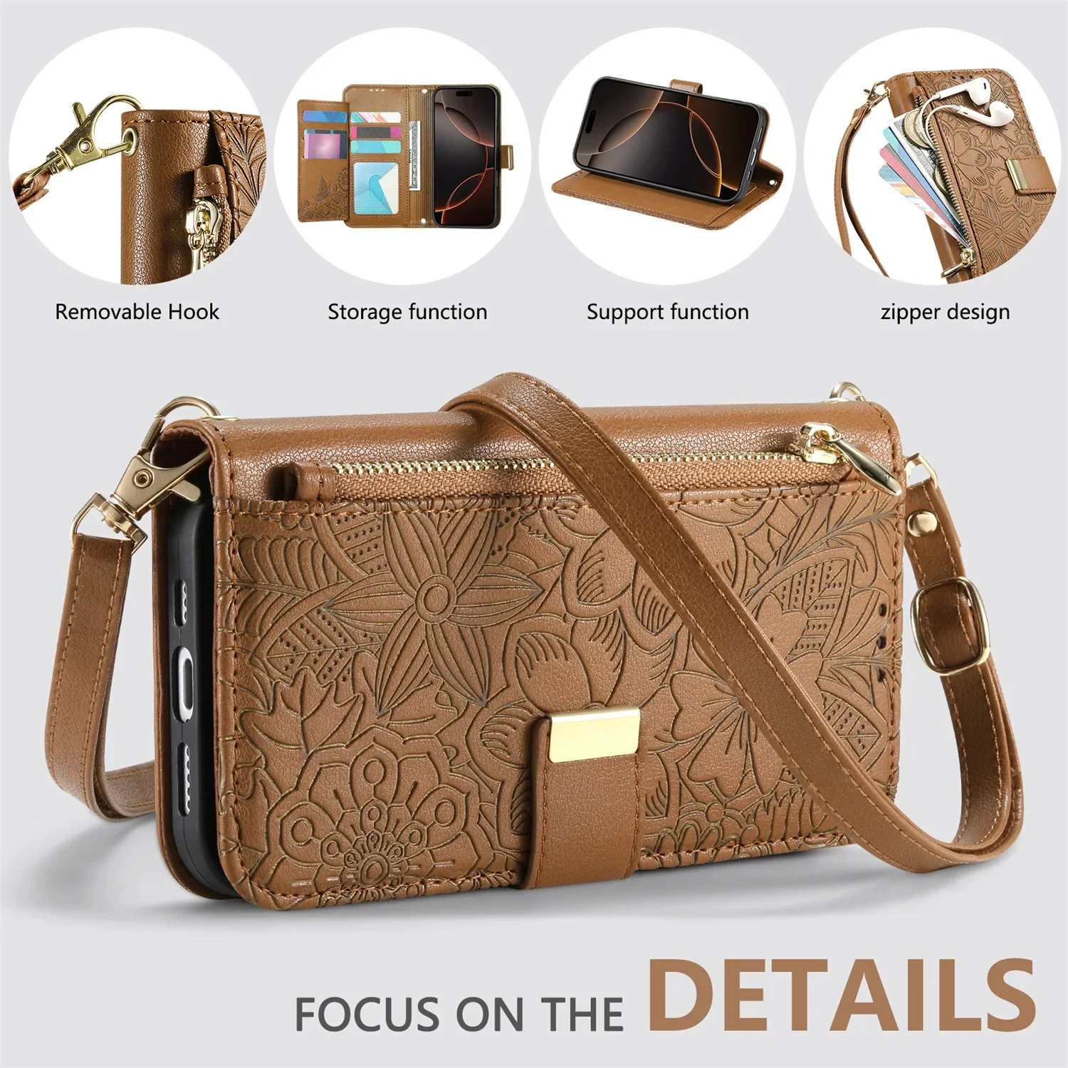 Zipper Crossbody Leather Flip Wallet Card Slot Phone Case for iPhone 16E 16 Plus 15 14 13 12 11 Pro Max Wrist strap Funda Cover