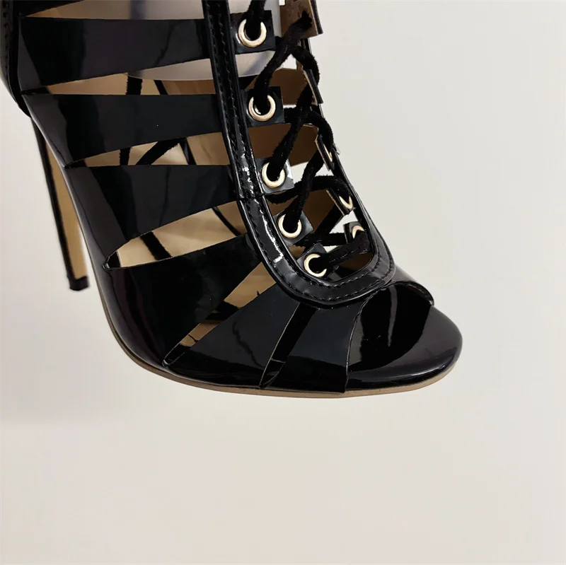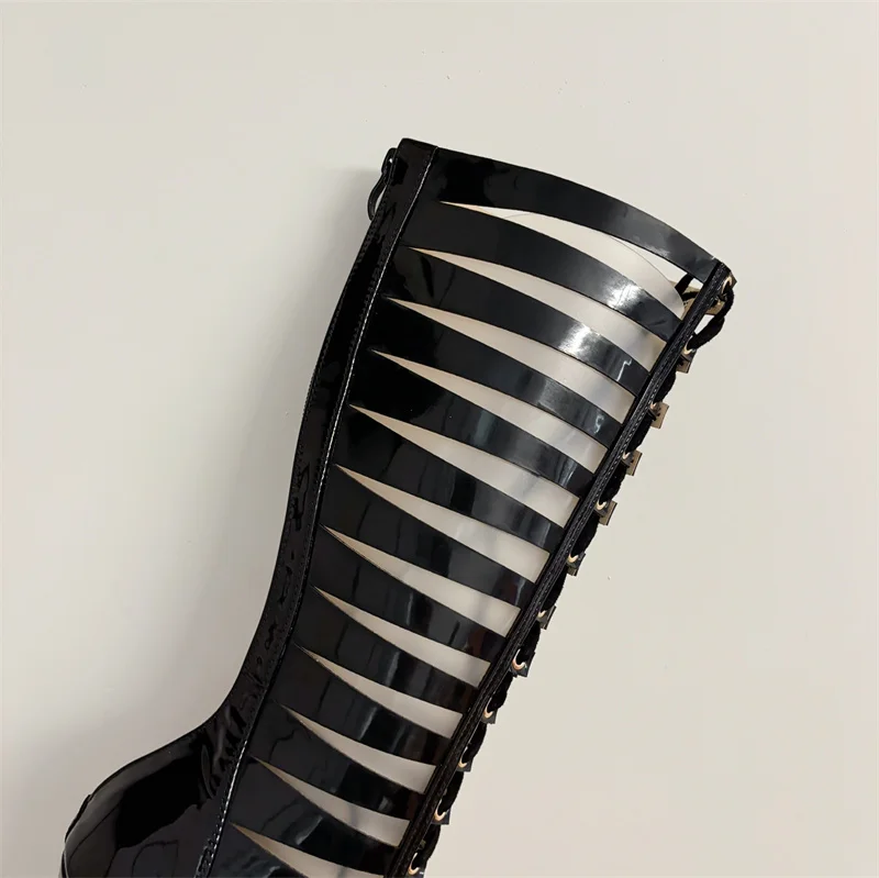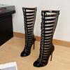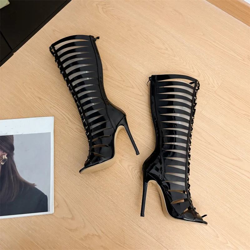 Liyke Fashion Hollow Out Cross Strap Knee High Boots Sandals Women Zip Sexy Peep Toe Stripper Heels Shoes Female Long Booties