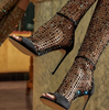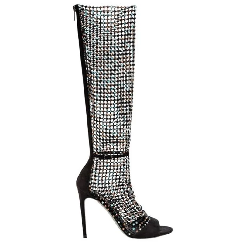 Luxury Black Net Mesh Over The Knee Boots Peep Toe Bling Bling Crystal Embellished Tight High Boot Cut-out Party Dress Shoes