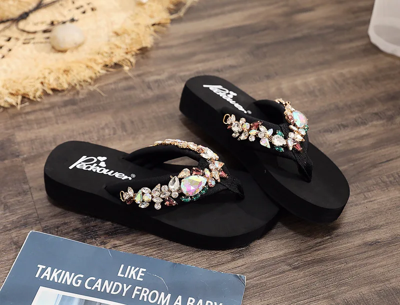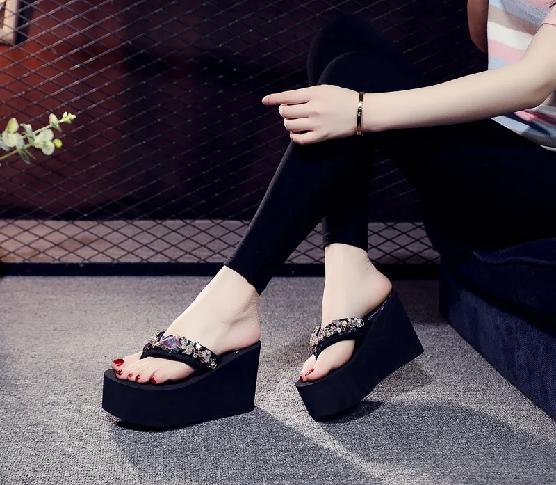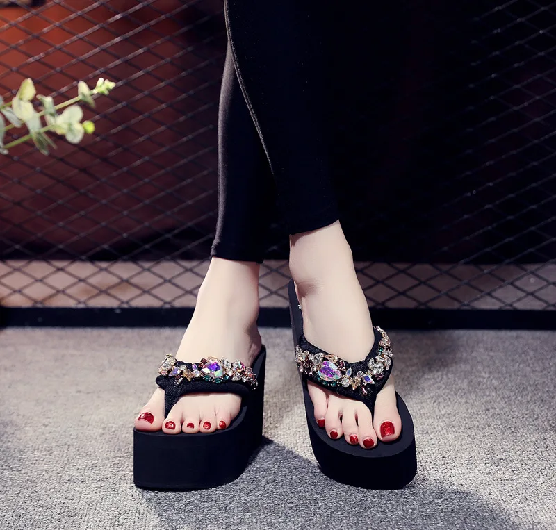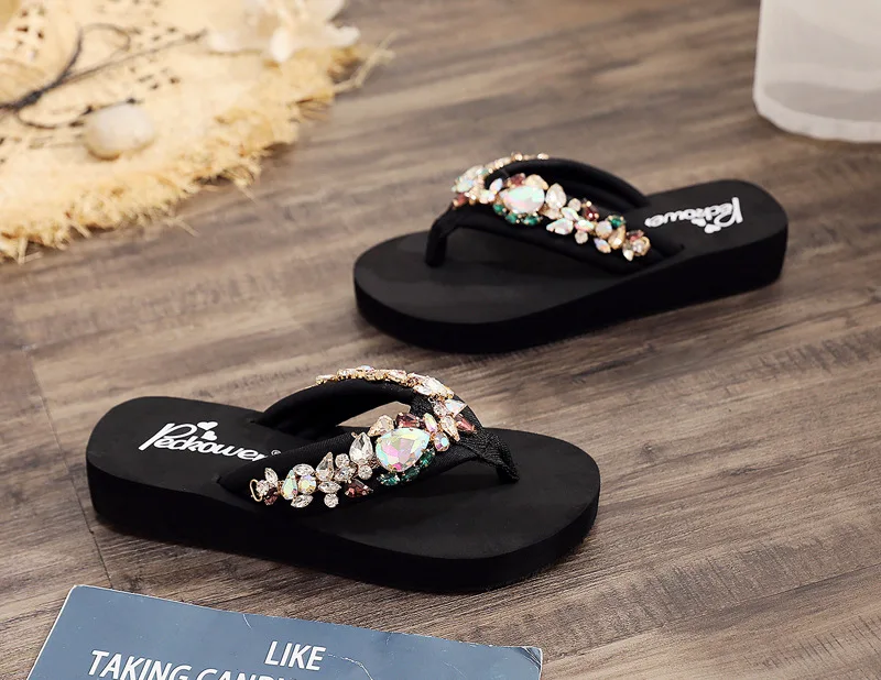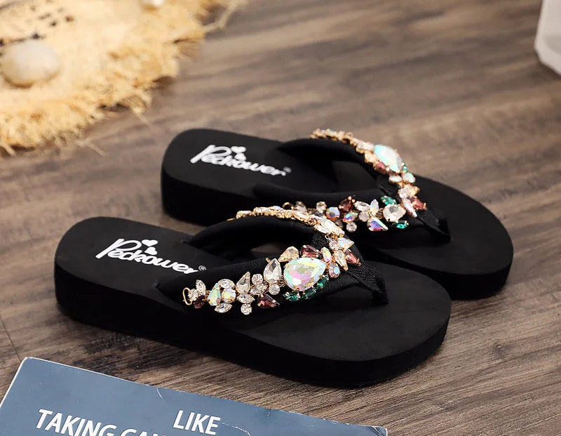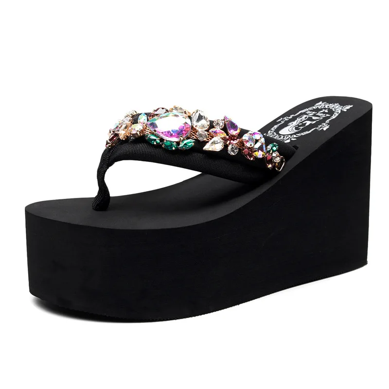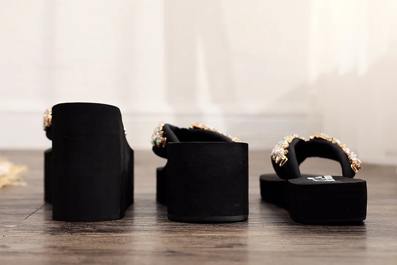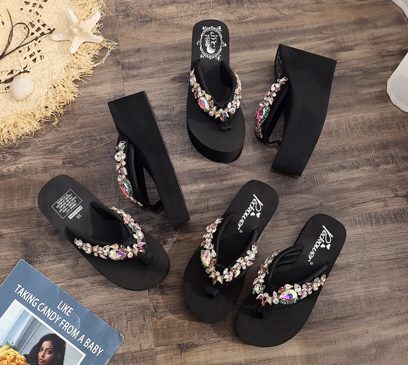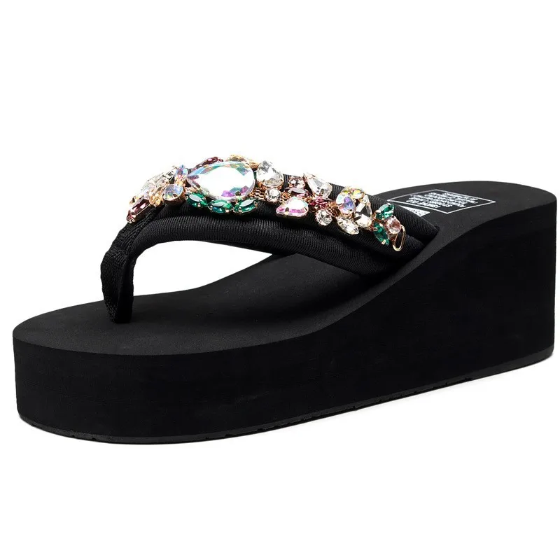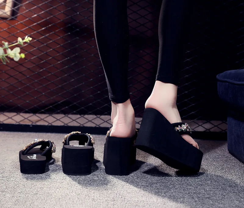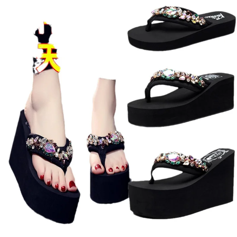Luxury Women’s Shoes for Summer Outwear Crystal Pearl Slope Heel Slippers for Beach Vacation Anti slip 11cm Heel High Slippers