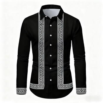Men’s Retro Geometric Print Long-Sleeve Shirt, Stylish Black and White Color-Blocked Slim Fit Shirt, Casual and Versatile Top