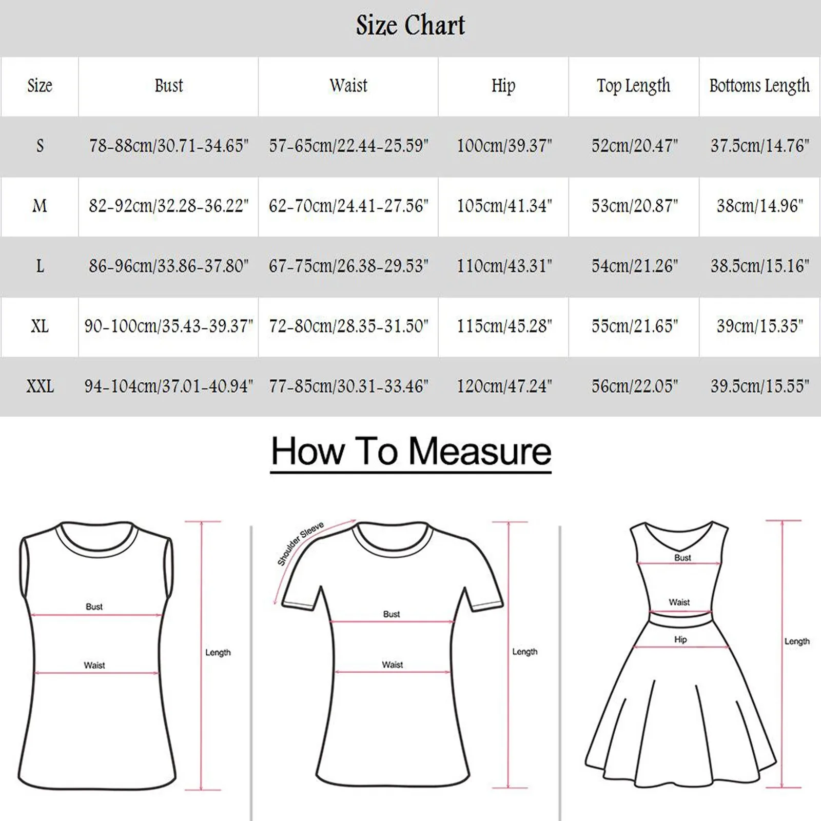 | Size:XL | Bust:90-100cm/35.43-39.37” | Waist:72-80cm/28.35-31.50” | Hip:115cm/45.28” | Top Length:55cm/21.65” | Bottoms Length:39cm/15.35” |