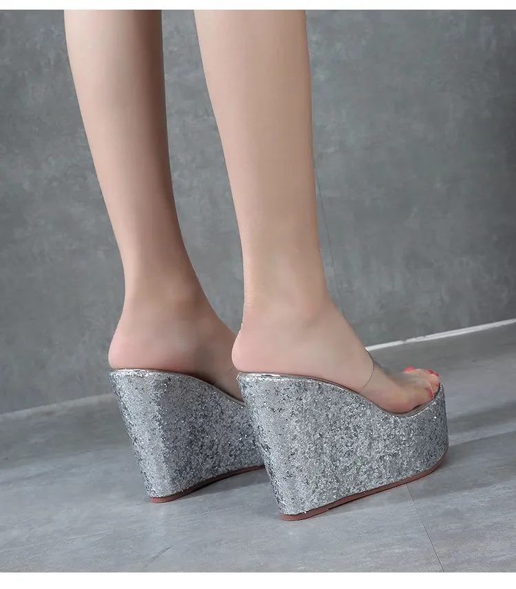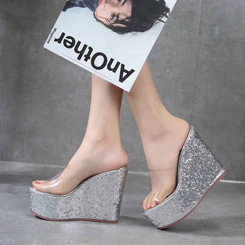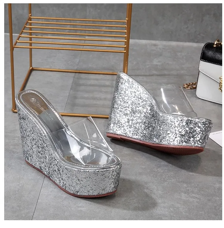 New Transparent PVC Slippers For Women 12CM 14CM Brand Sandals Gold Silvery Thick Sole Wedges Summer Shoes Sequin High Heels