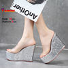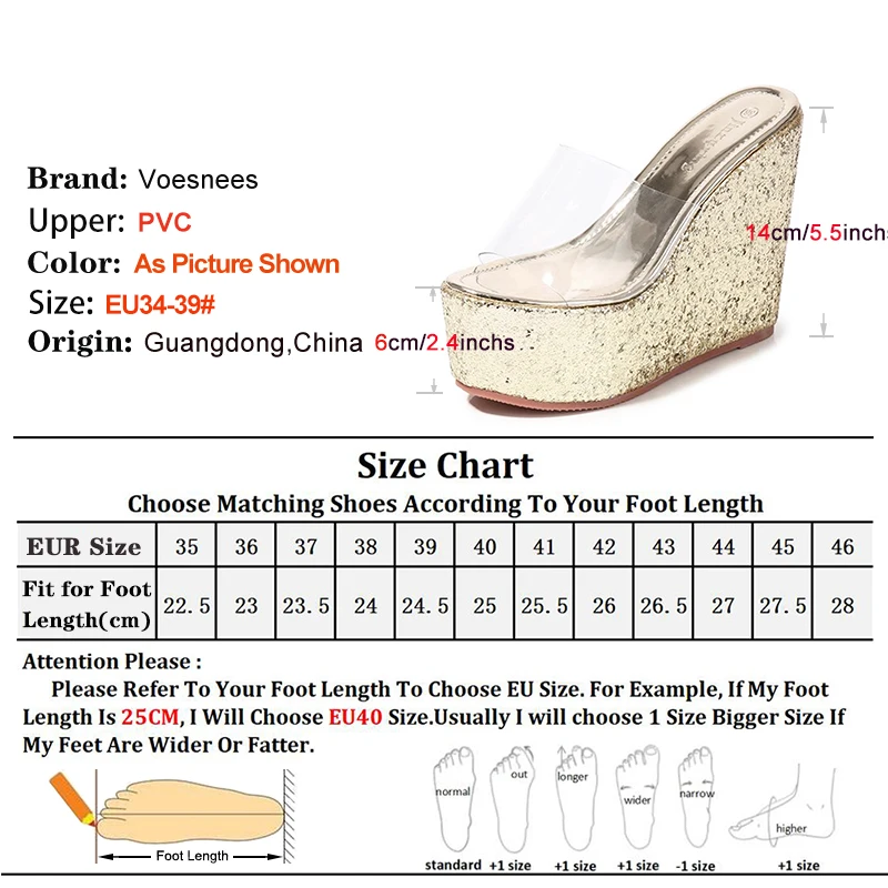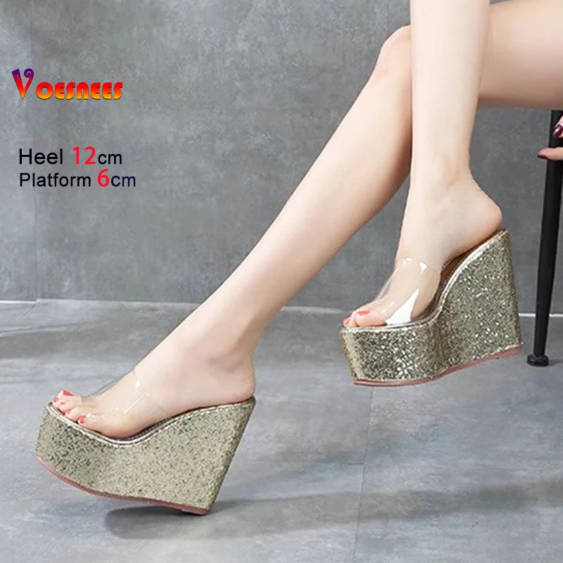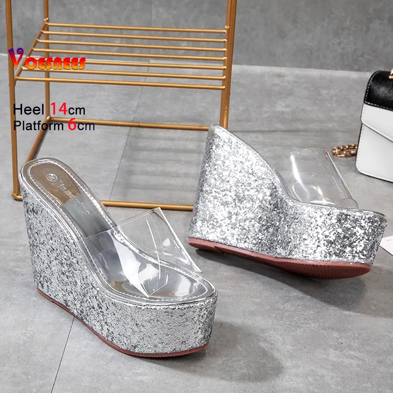 New Transparent PVC Slippers For Women 12CM 14CM Brand Sandals Gold Silvery Thick Sole Wedges Summer Shoes Sequin High Heels