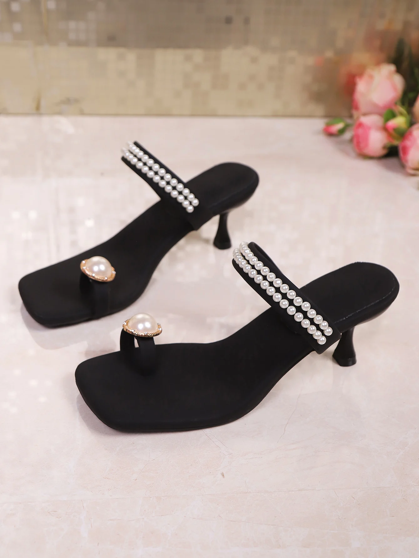 Pearl Toe Sandals, Women’s 2025 Summer New Outerwear High-heeled Flip-flops, Kitten and French Square One-shoulder Flip-flops