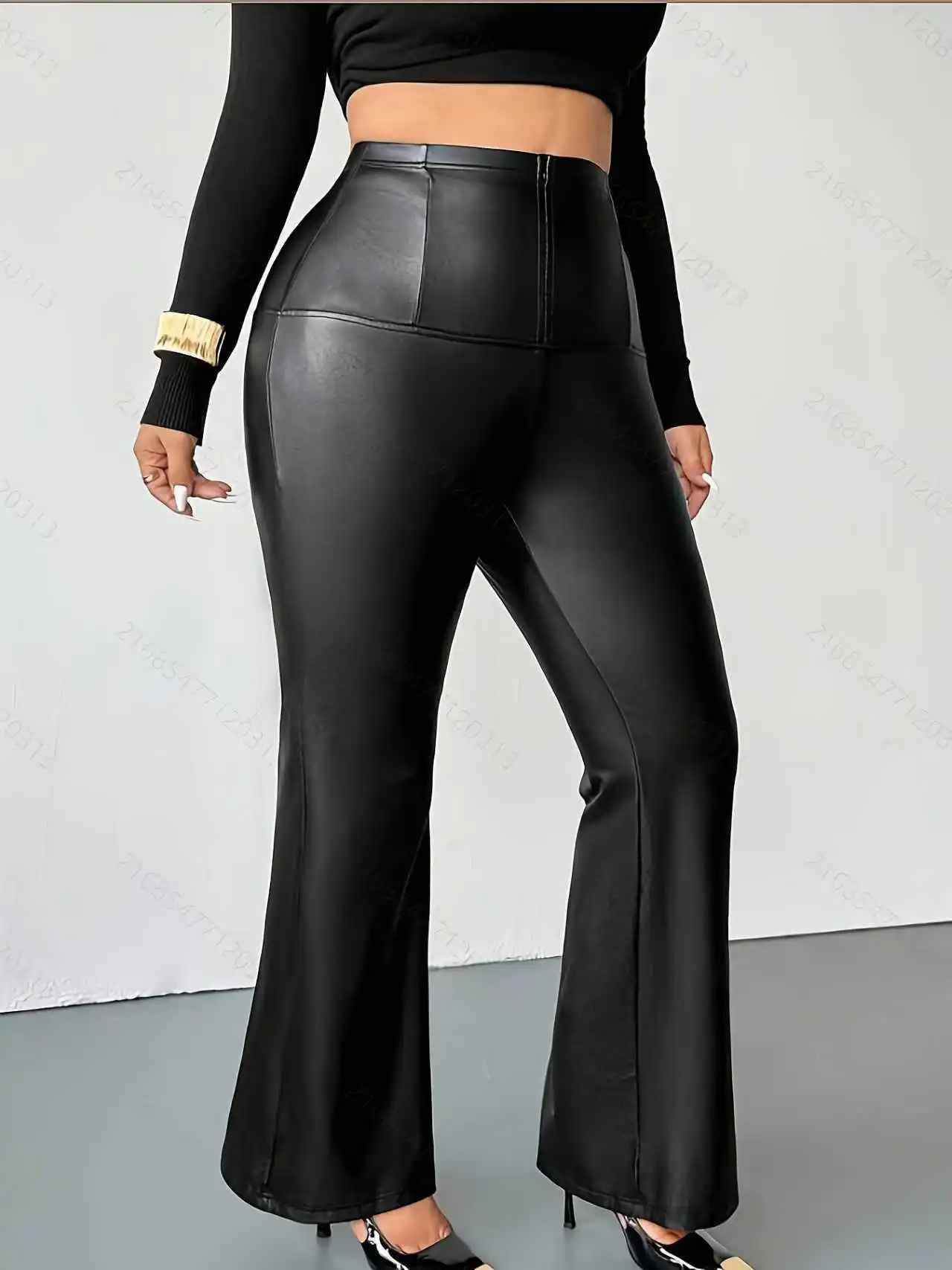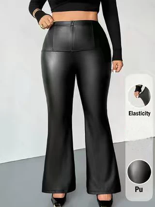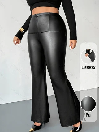 Plus size black PU leather vintage hot girl style slightly flared pants for women with zipper high waist stretch slim fit bell b