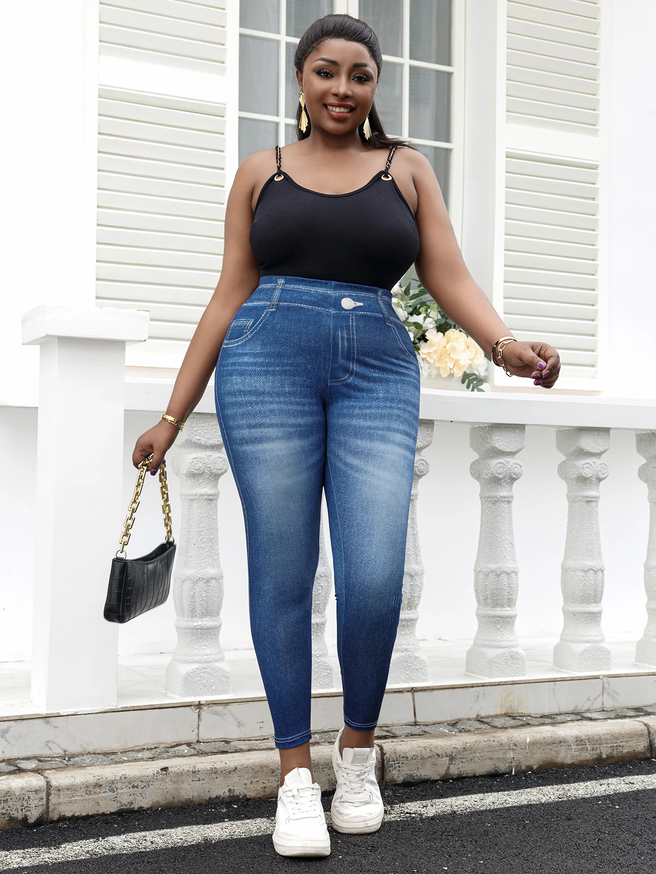 Plus Size Women’s Imitation Jeans Leggings Vintage Wash Design Mid-Waisted Knit Pants Stretchy and Trendy Athletic Trousers