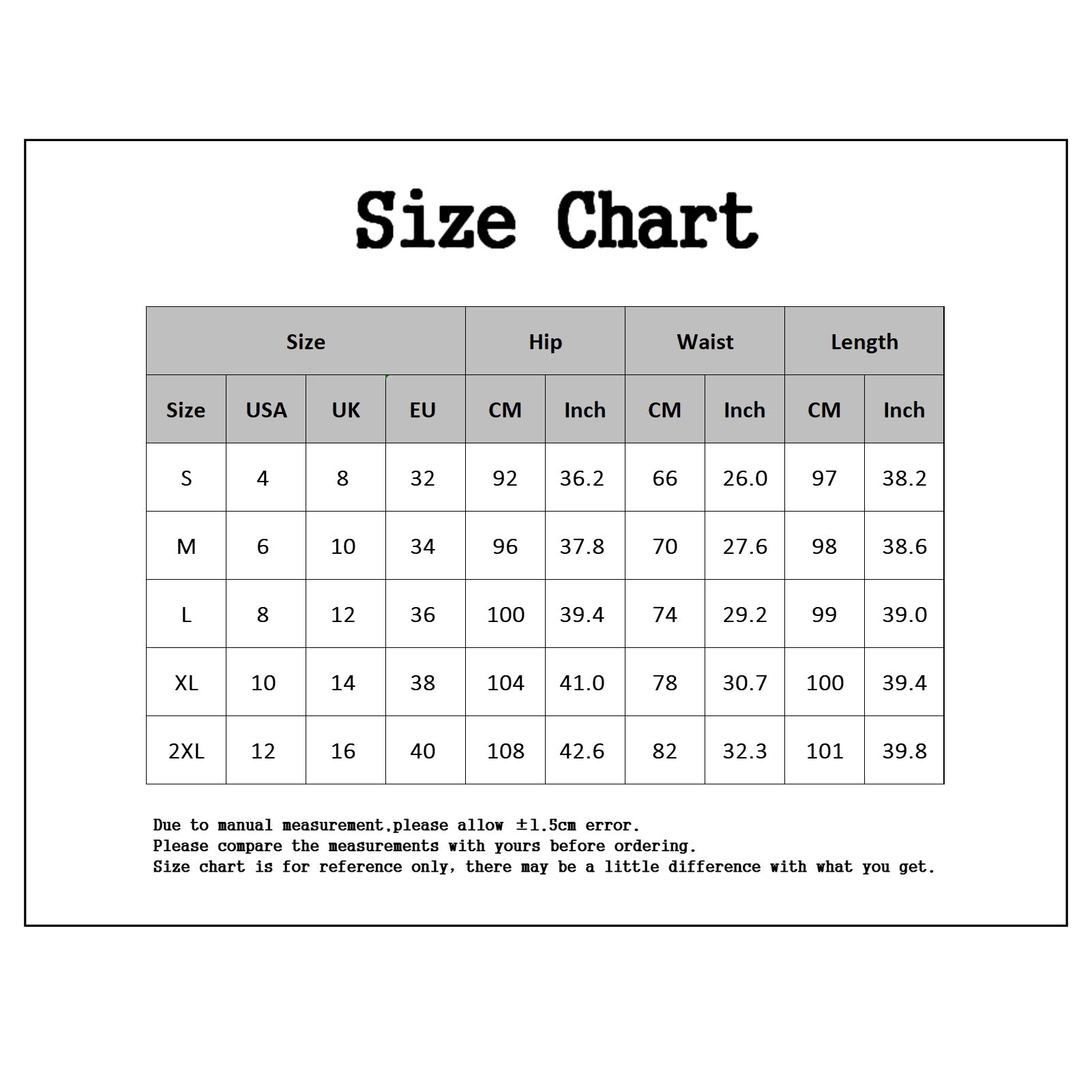 [Our Size XXL] Length: 101cm/39.76″, Waist: 82cm/32.28″, Hip: 108cm/42.52″(Approx.)