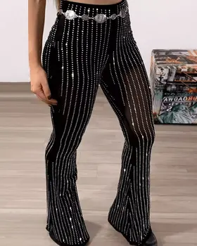 Bling Sparkly Pants for Women Sheer Mesh Rhinestone Decor High Waist Skinny Flared Pants Christmas Stage Trousers Party Club