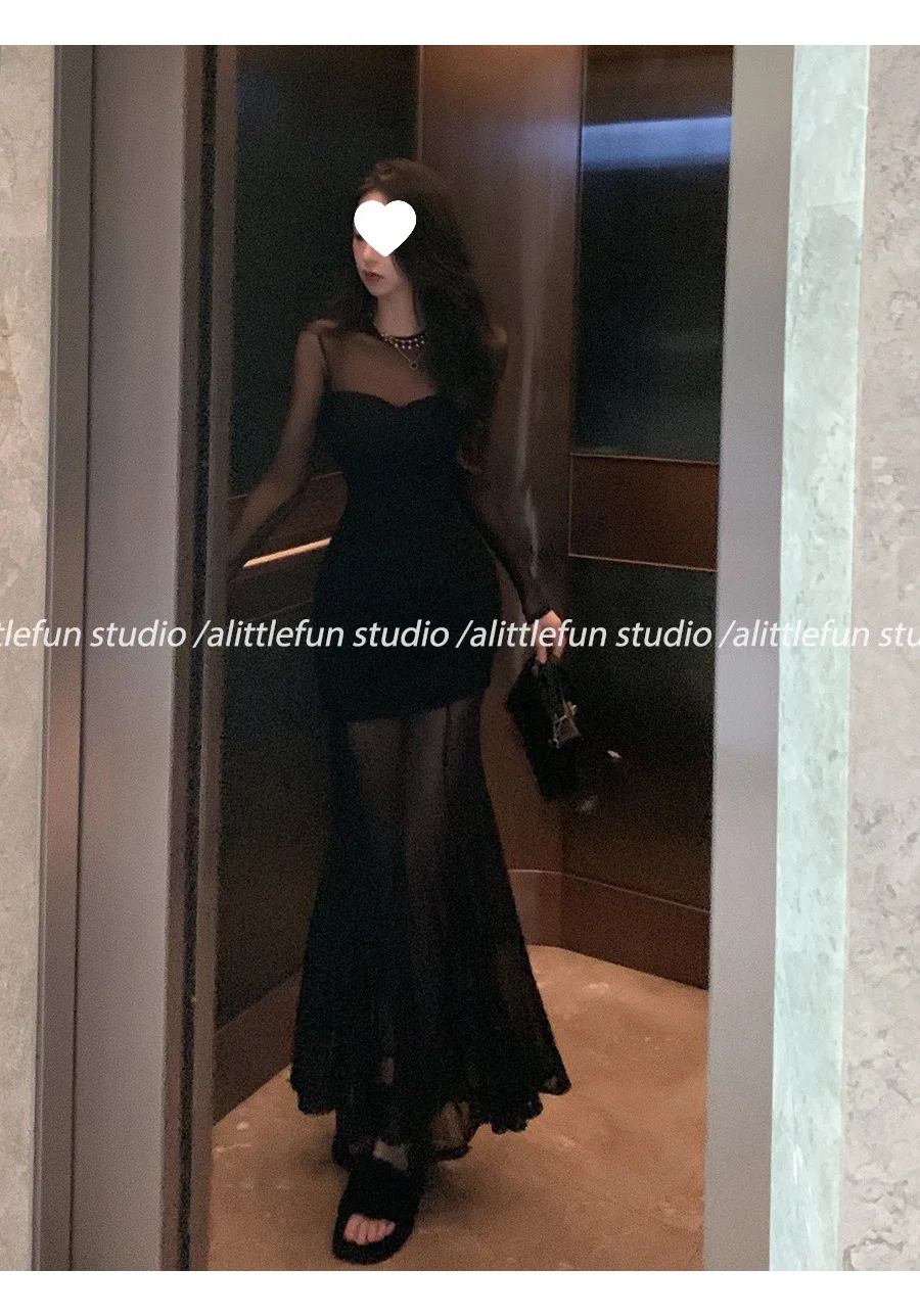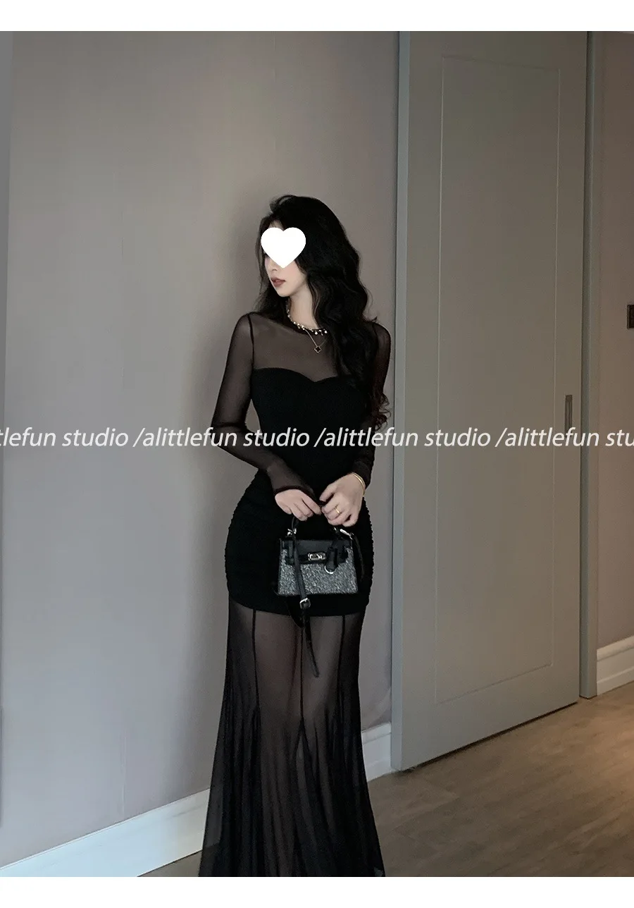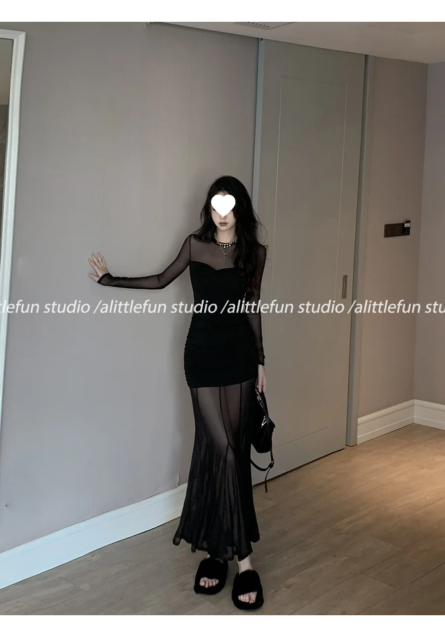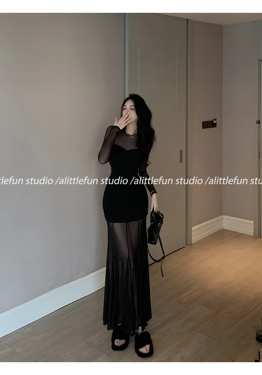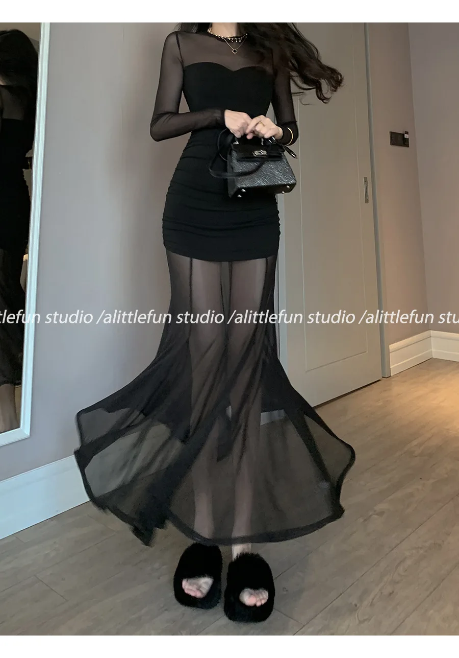 Pure Desire Sexy Long Sleeve Mesh Splice Dress Women’s Autumn Hot Girl Waist in Slimming Fish Tail Long Dress