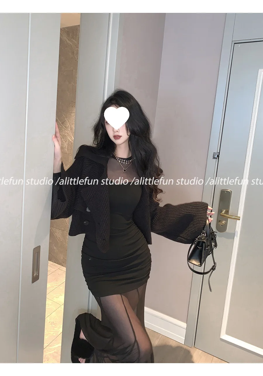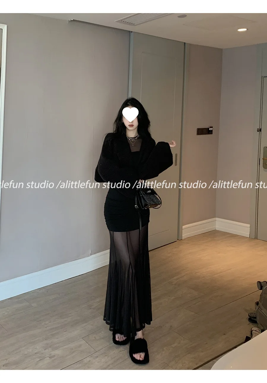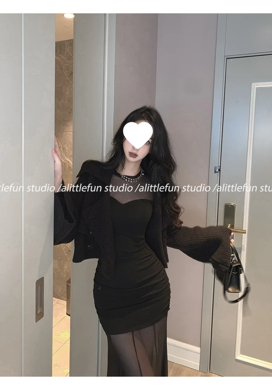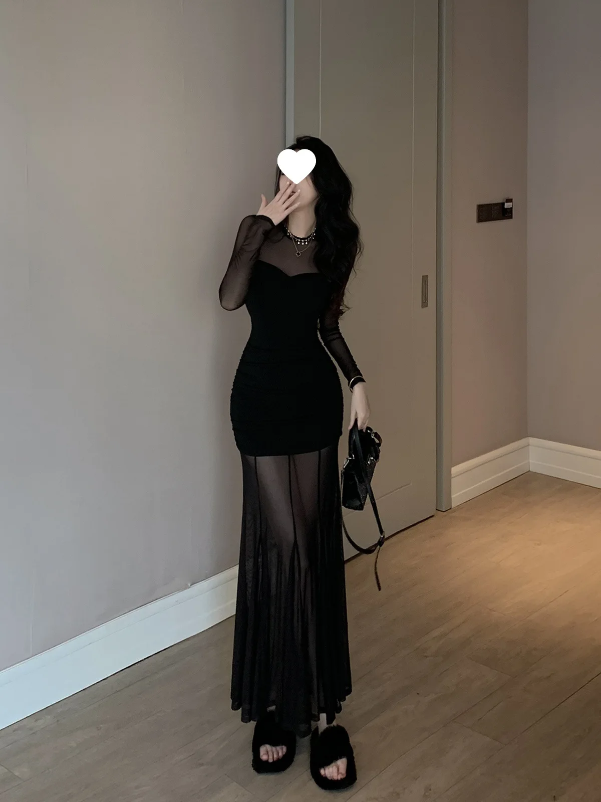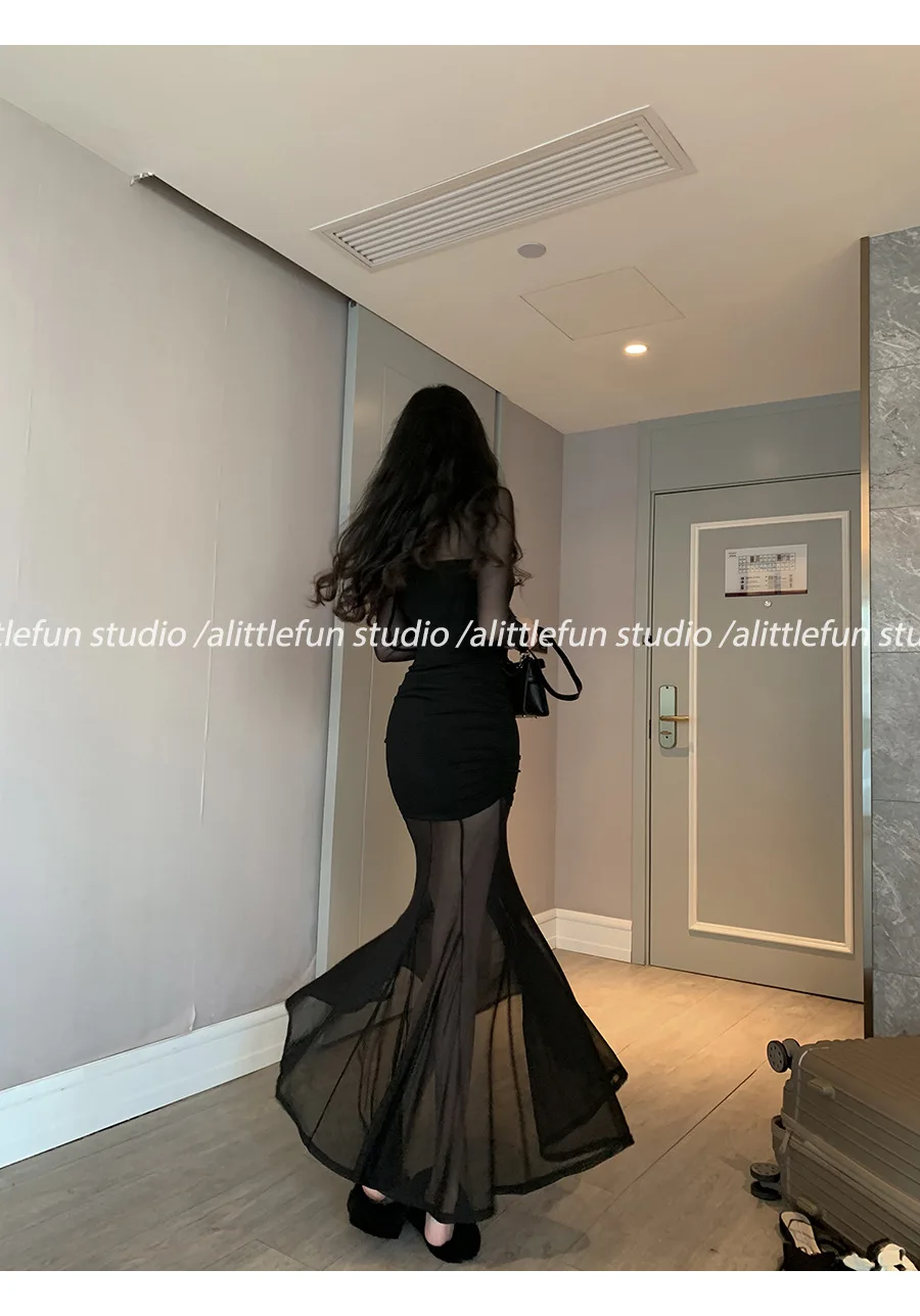 Pure Desire Sexy Long Sleeve Mesh Splice Dress Women’s Autumn Hot Girl Waist in Slimming Fish Tail Long Dress