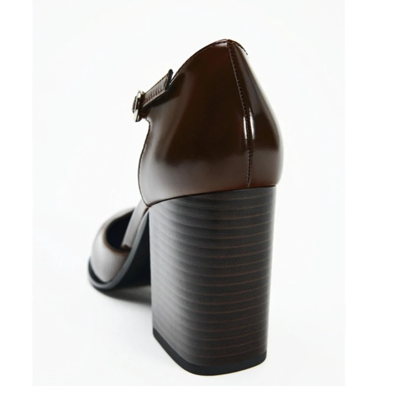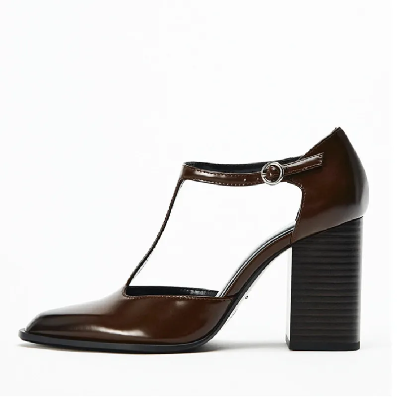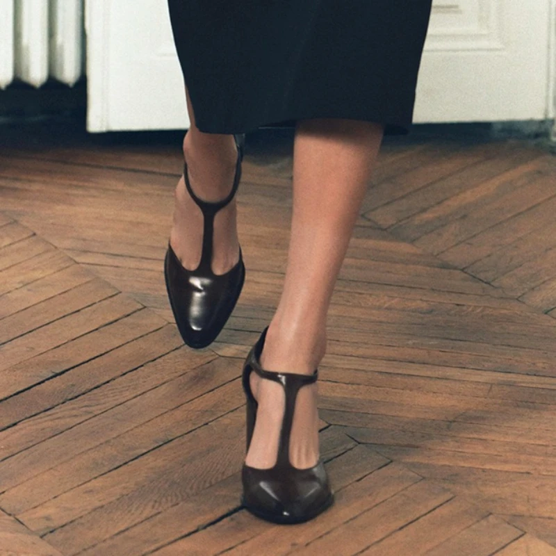 Retro T-strap Design Mary Jane Shoes Women Brown Patent Leather Ankle Strap Buckle Heels Elegant Pointed Toe Chunky Heel Sandals