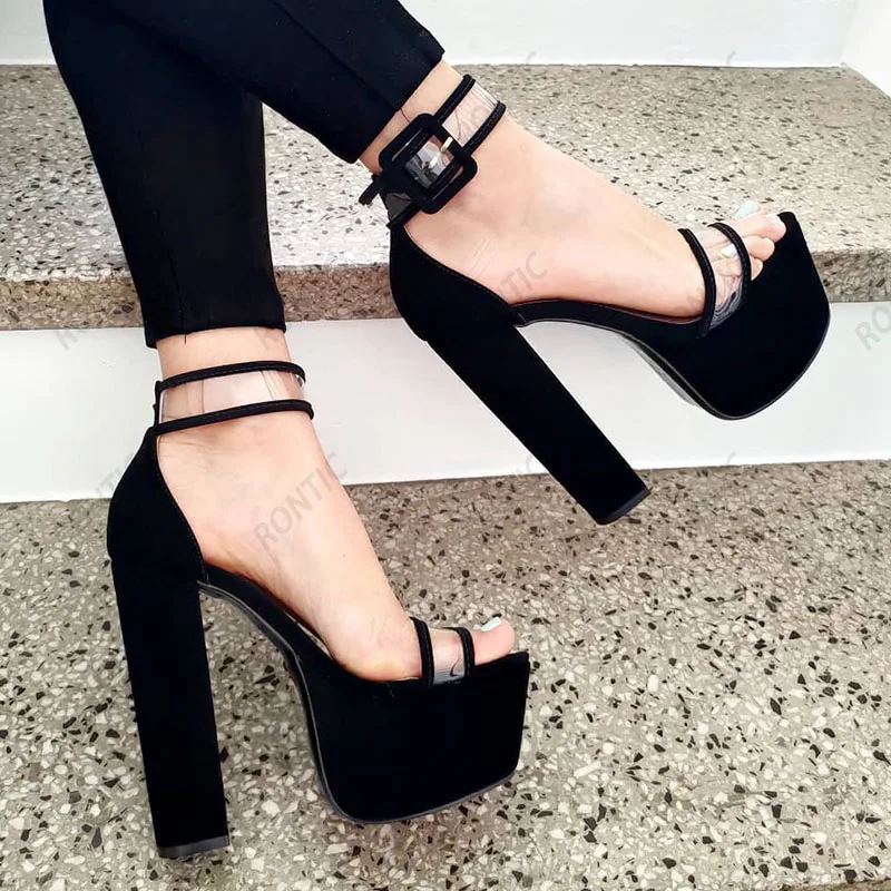 Rontic Handmade Women Platform Sandals Faux Suede Ankle Strap Buckle Chunky Heel Open Toe Elegant Black Party Shoes US Size 5-20