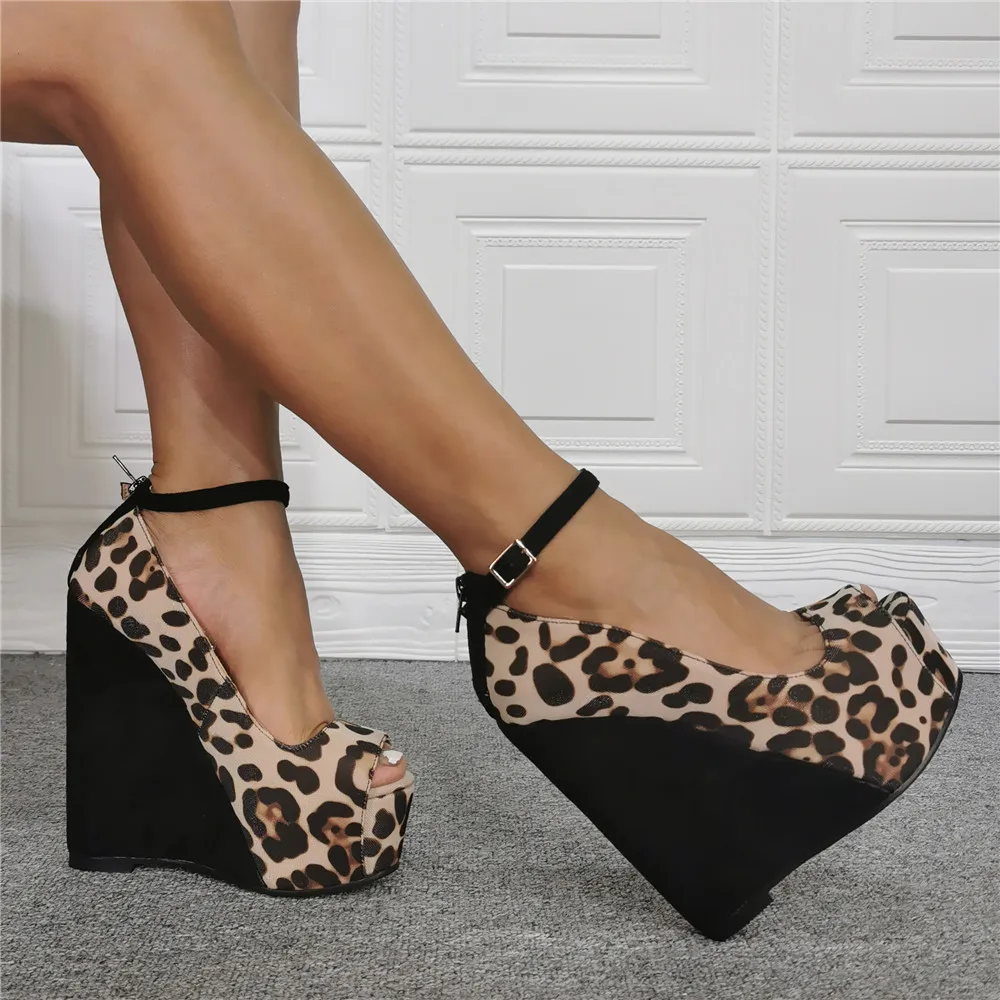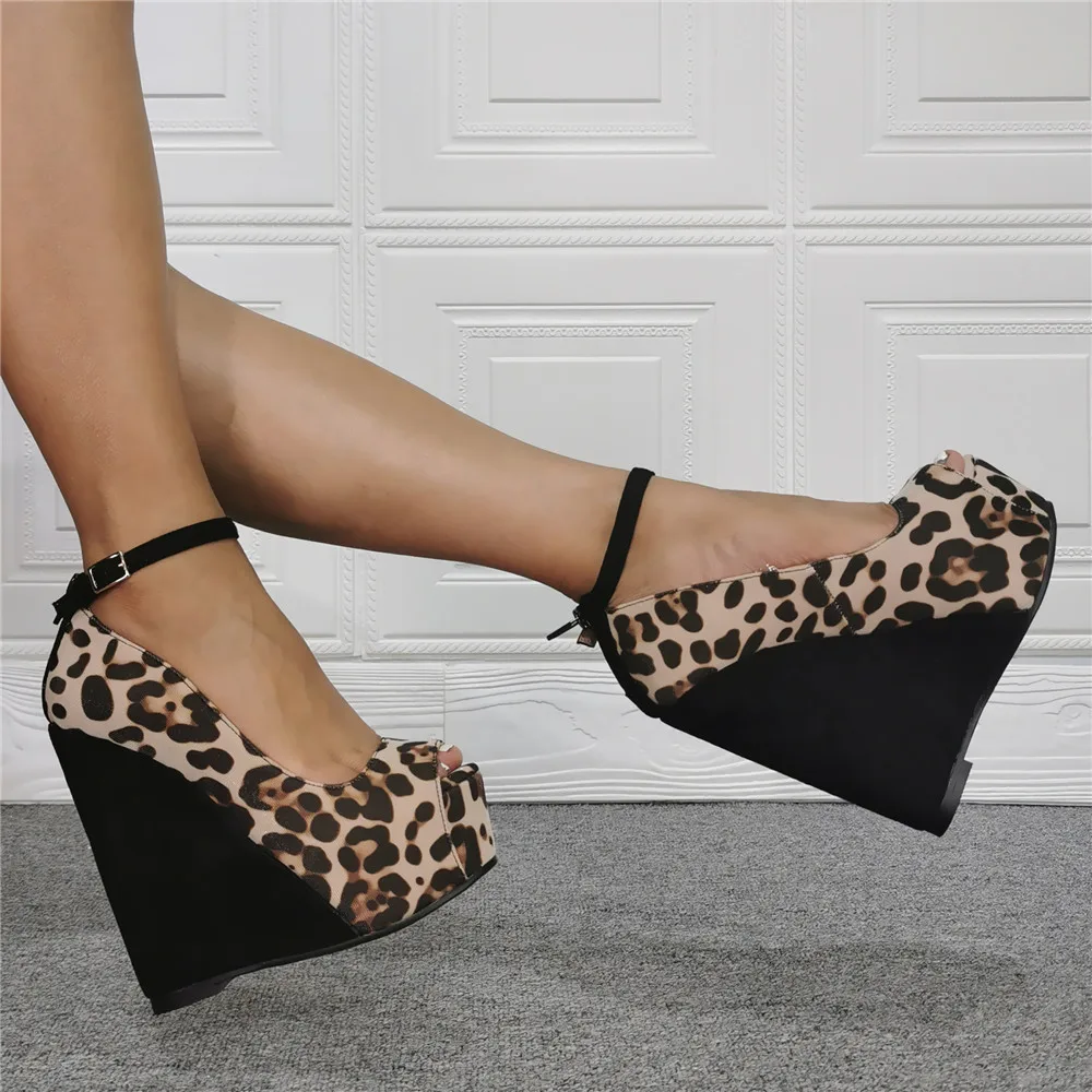 Sexy Lady High Wedge Leopard Platform Peep Toe Pumps Woman High Wedge Leopard Pumps Real Photos Plus Size Custom Make
