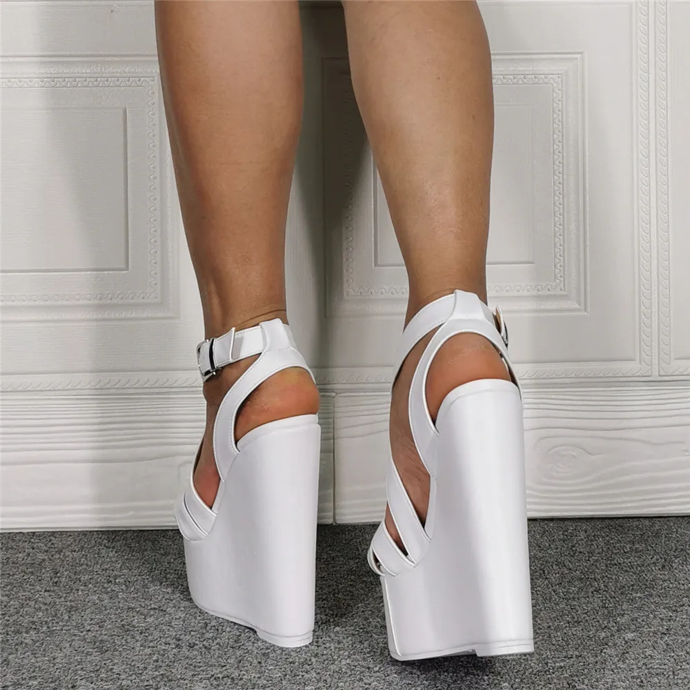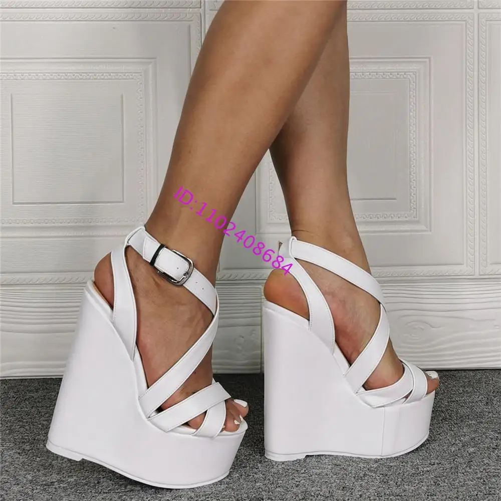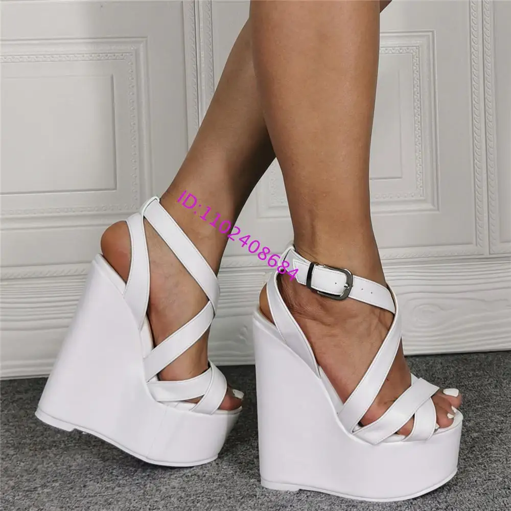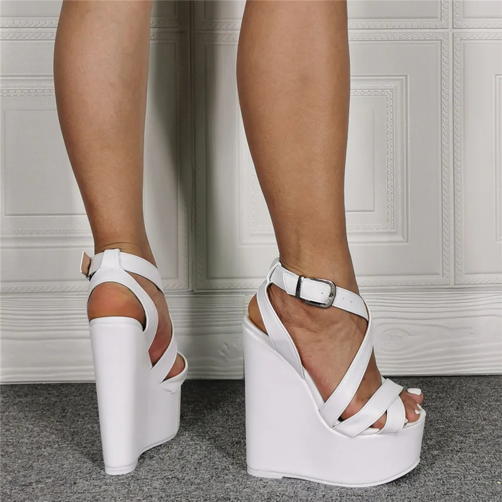 Sexy Lady White High Heel Wedge Sandal Cross Belt Strap High Platform plus Size 43 Comfortable Cushioned Footbed