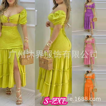 Commuting Style 2025 Fashion Holiday Floral Print O Neck Crop Top Shirr Slit High Waist Women Maxi Skirt Casual Sexy Sets