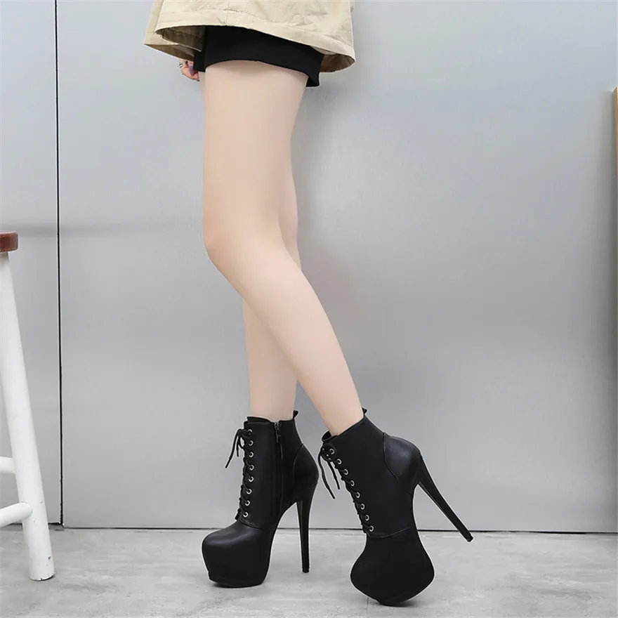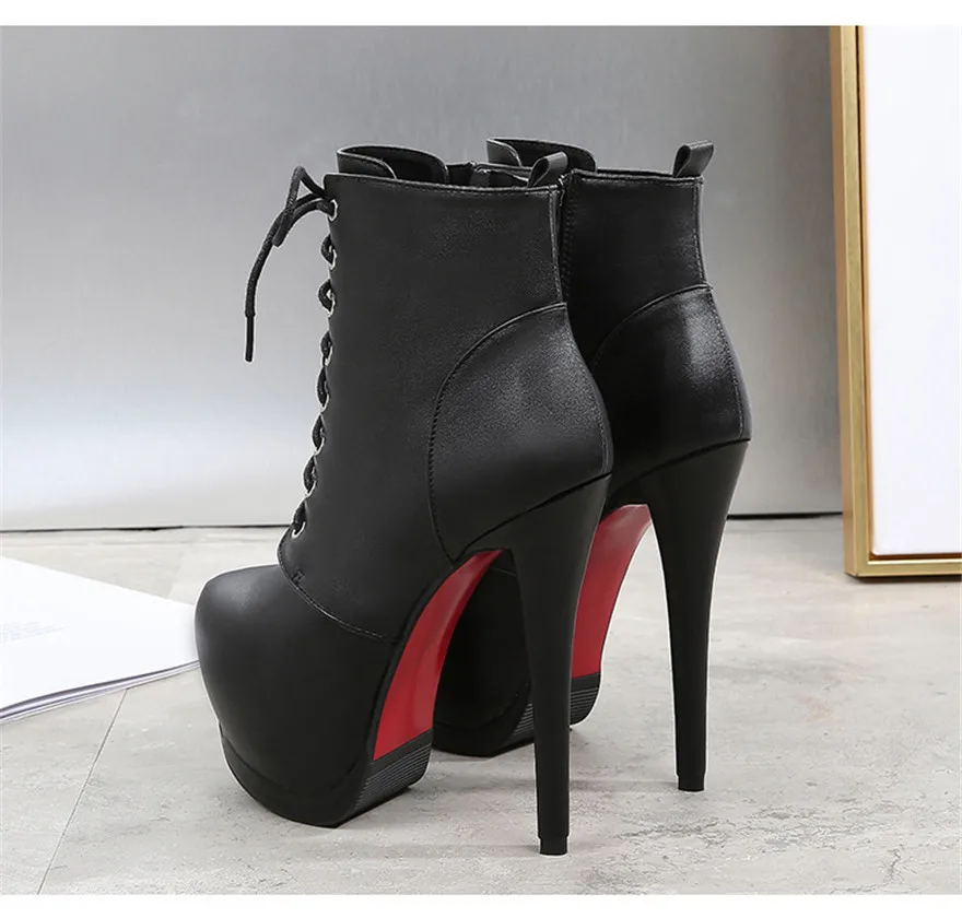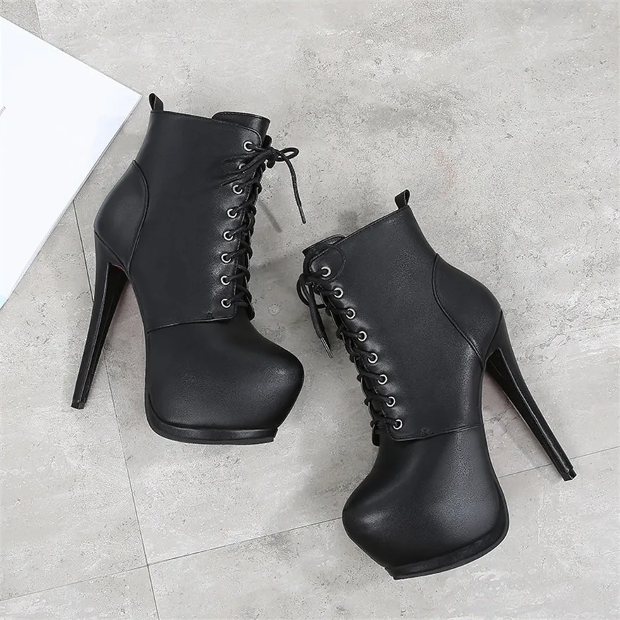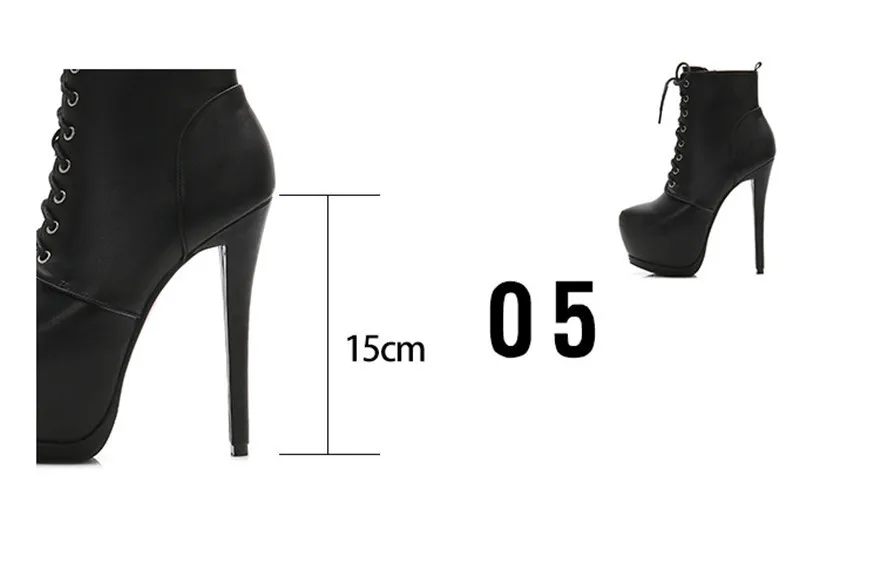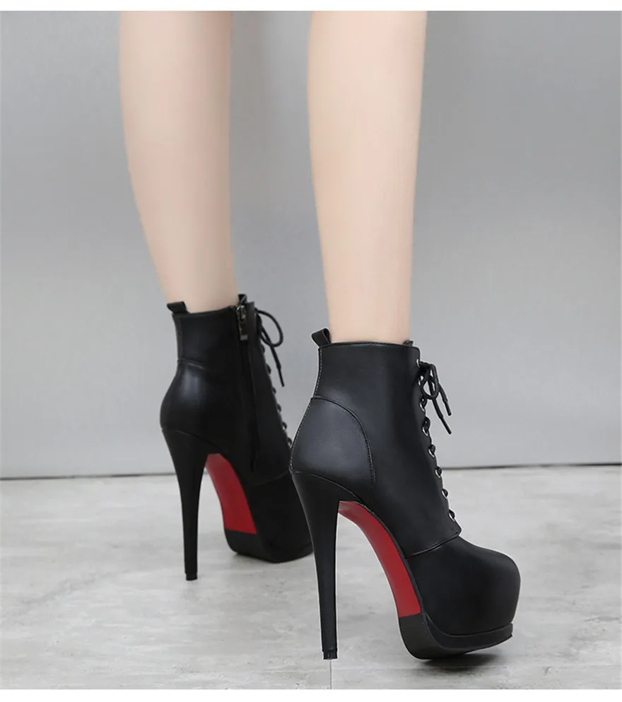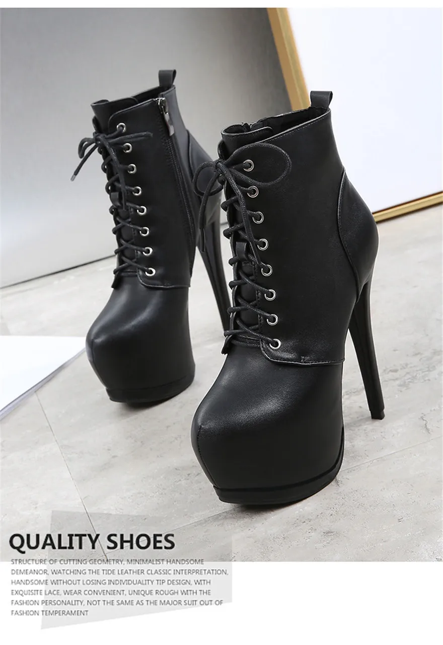 Sexy Super High Heels 15CM Party Boots Women Black Soft Leather Fashion Platform Ankle Boots New Pointy Toe Female Lace Up Shoes