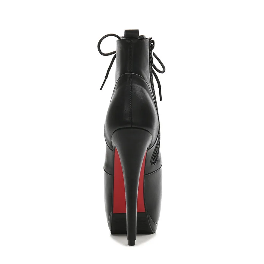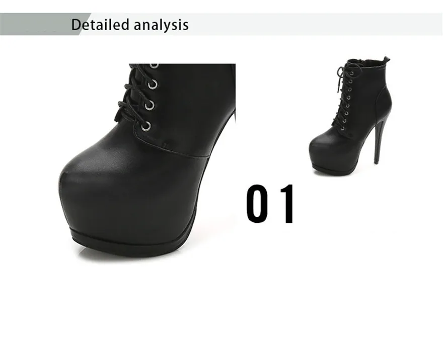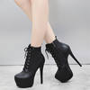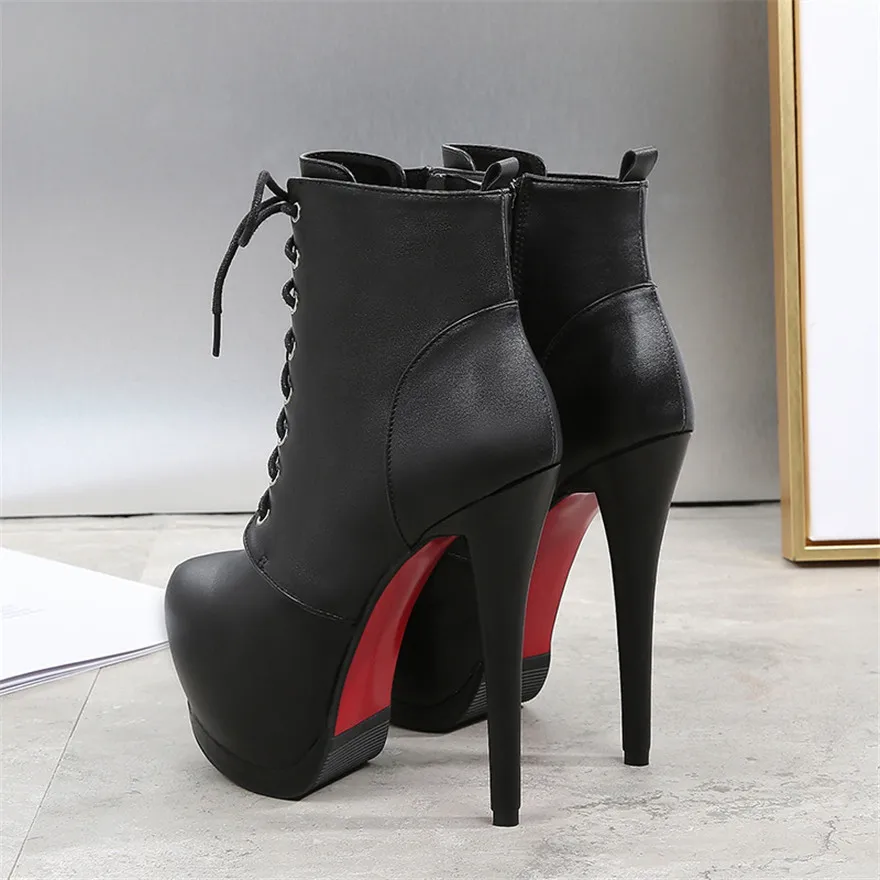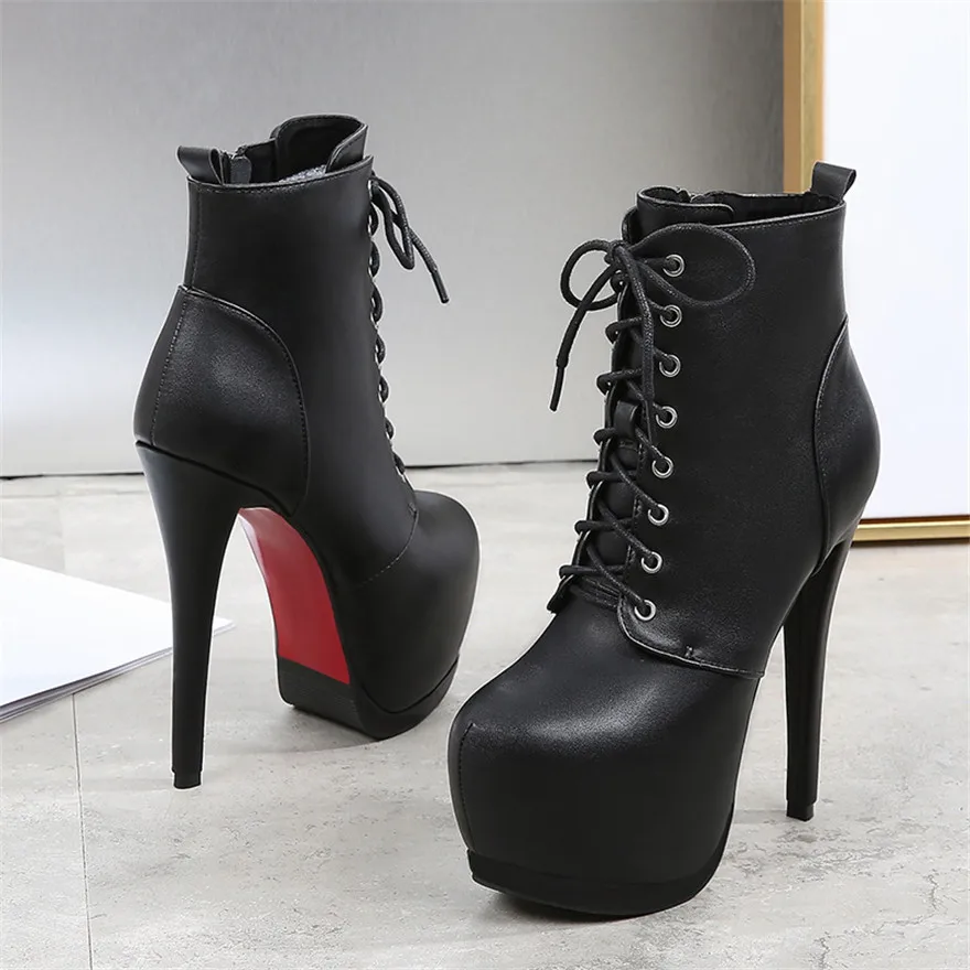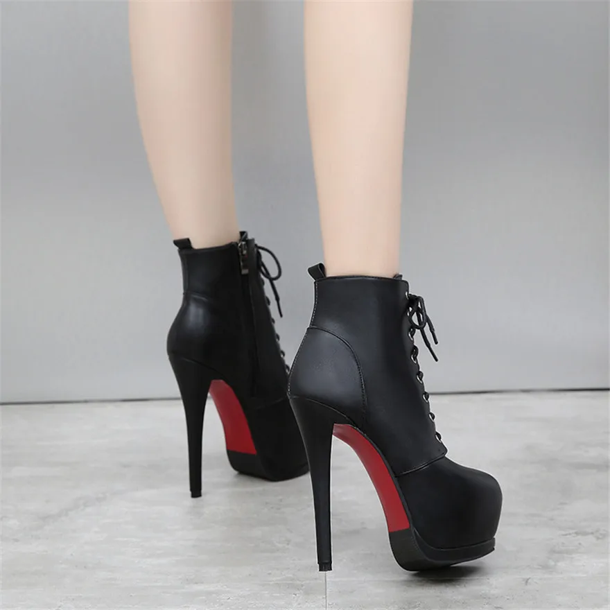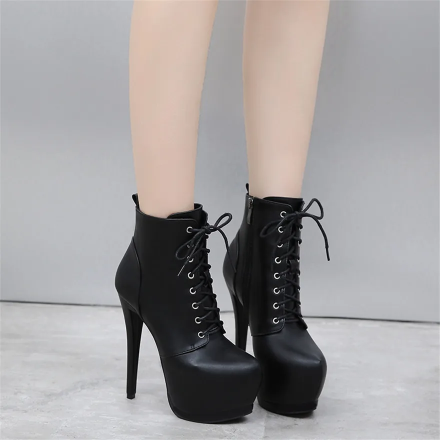Sexy Super High Heels 15CM Party Boots Women Black Soft Leather Fashion Platform Ankle Boots New Pointy Toe Female Lace Up Shoes