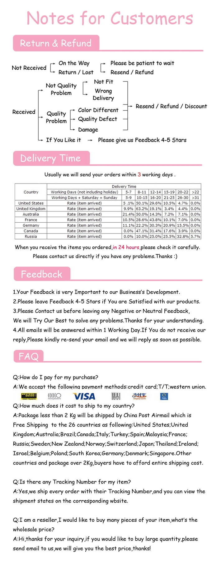 • If you did not receive the product within the guaranteed time( 45 days not including 2-5 day processing) you can request a refund or a reshipment.