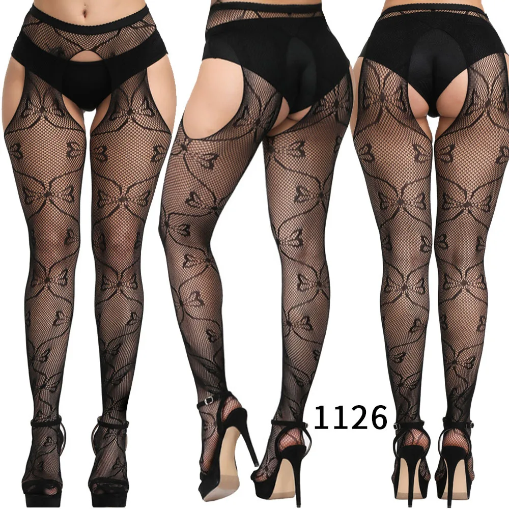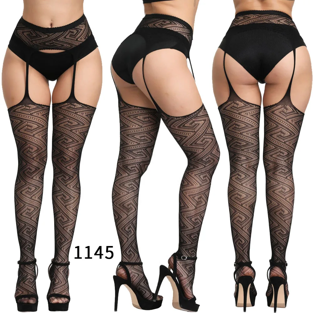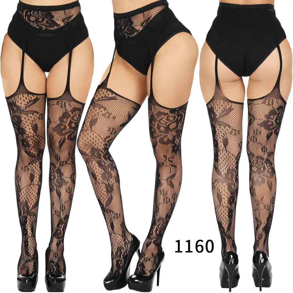 Sexy Women Stockings Fishnet Tights Transparent Crotchless Pantyhose Thigh High Elastic Embroidery Stocking With Garter Belt