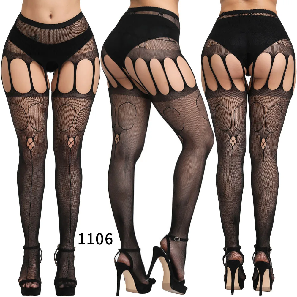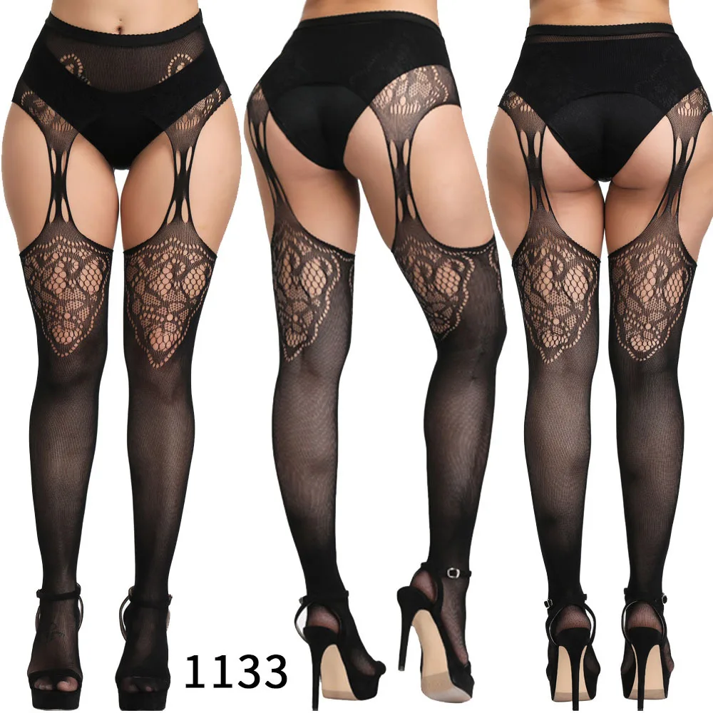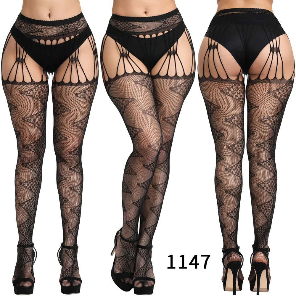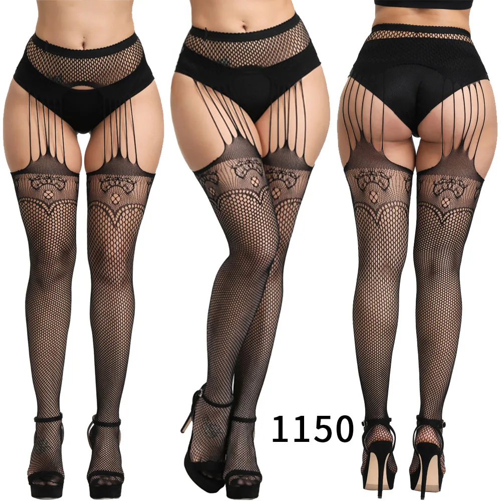 Sexy Women Stockings Fishnet Tights Transparent Crotchless Pantyhose Thigh High Elastic Embroidery Stocking With Garter Belt