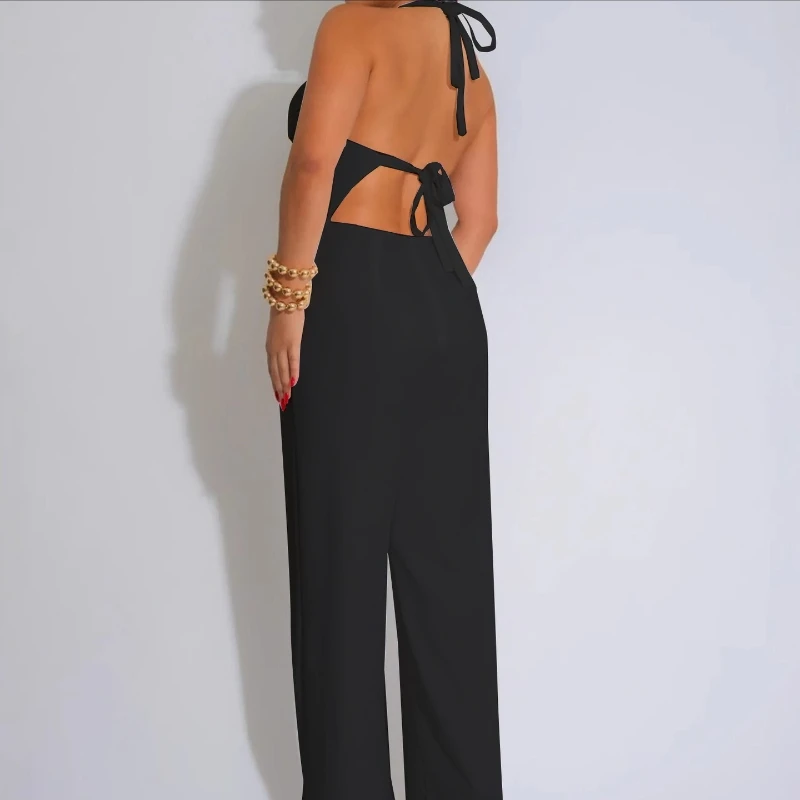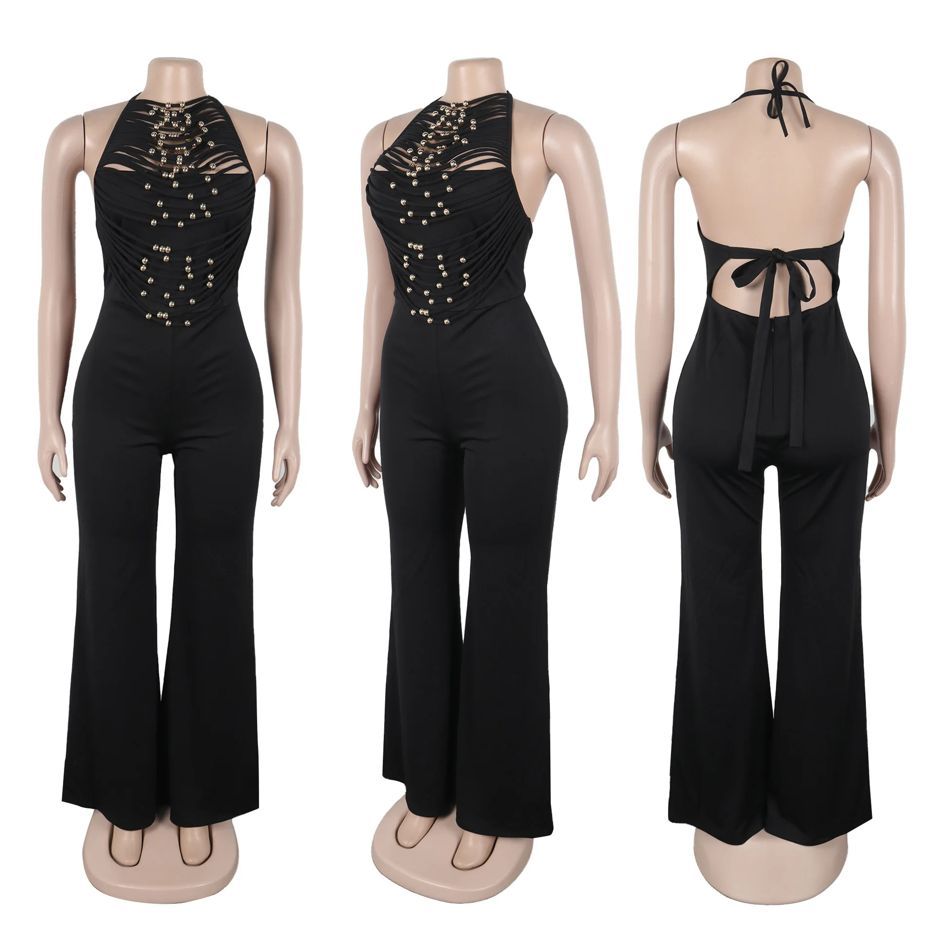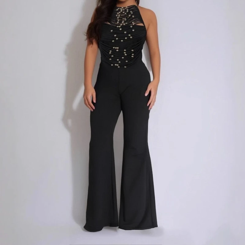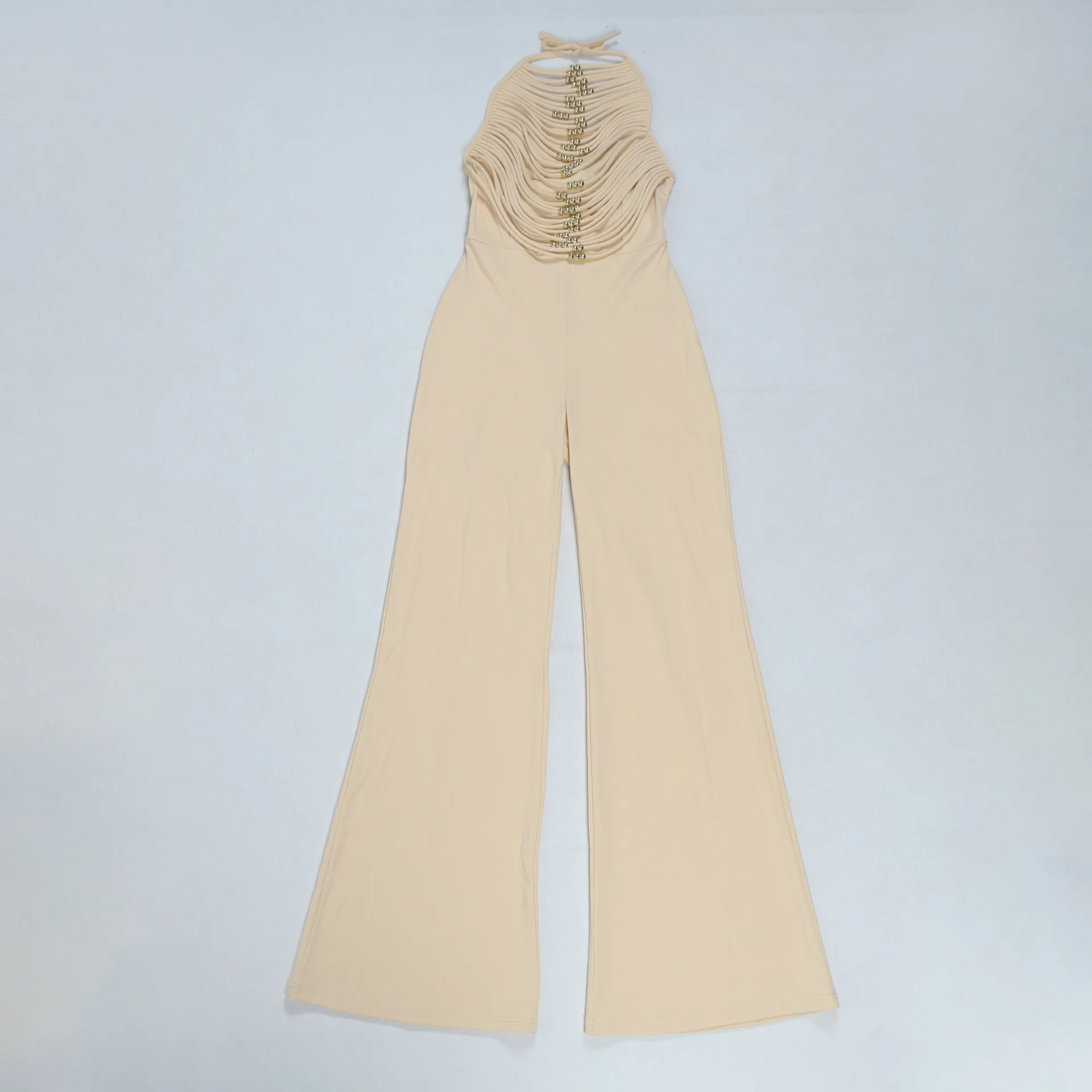 Sexy Women’s Beaded Halter Jumpsuits Overalls Summer 2025 Backless Fitted Wide Legs Rompers One Piece Outfits Clubwear Party