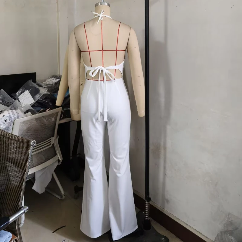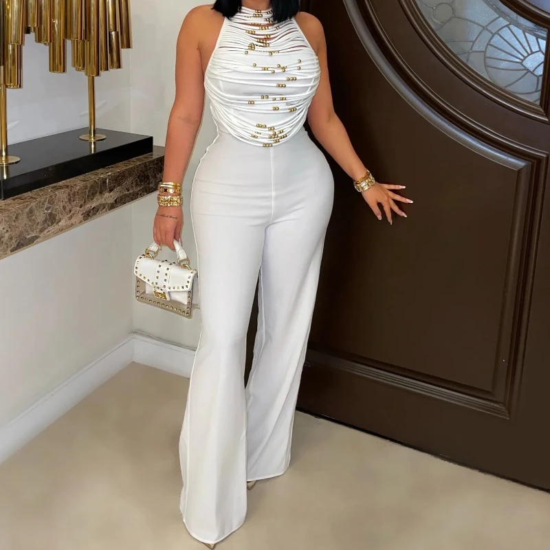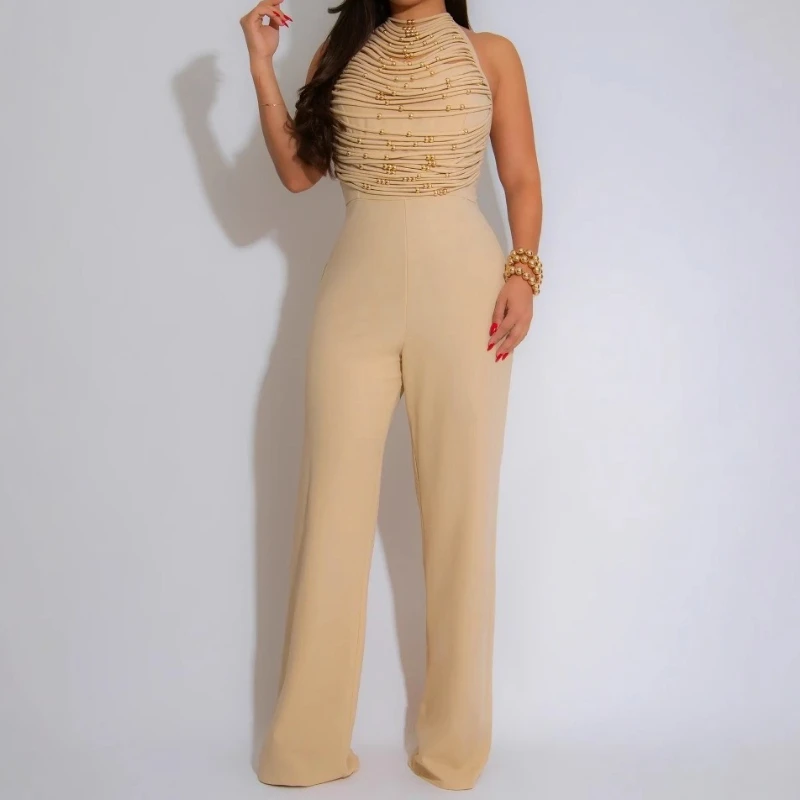 Sexy Women’s Beaded Halter Jumpsuits Overalls Summer 2025 Backless Fitted Wide Legs Rompers One Piece Outfits Clubwear Party
