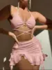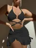 Sexy Yellow Bikini Women Solid Halter Ring Linked Criss Cross Cover Up 3 Piece Swimsuit 2024 Bathing Suit Ruffles Skirt Swimwear