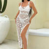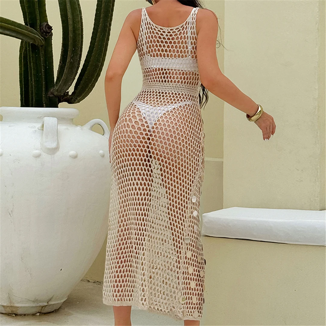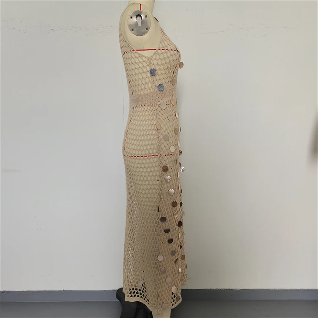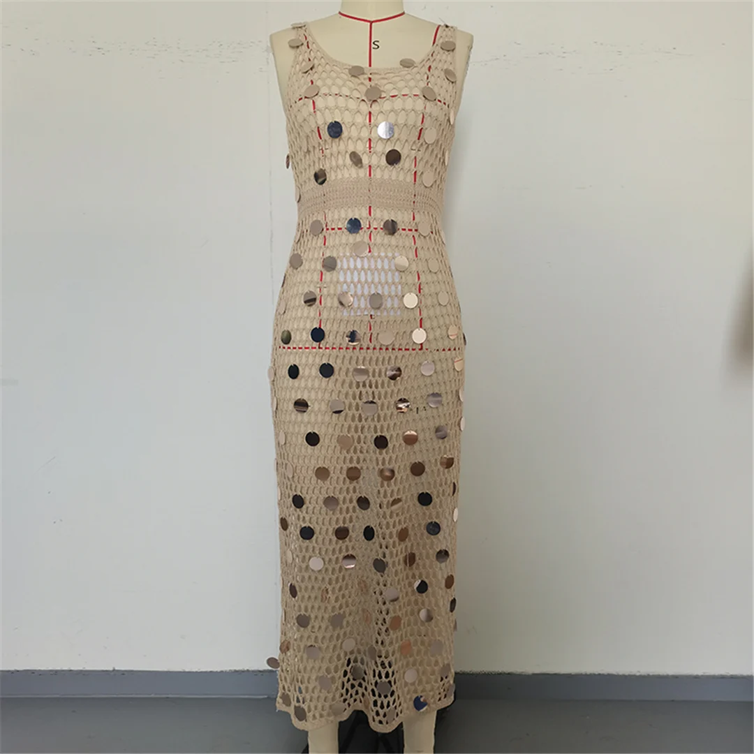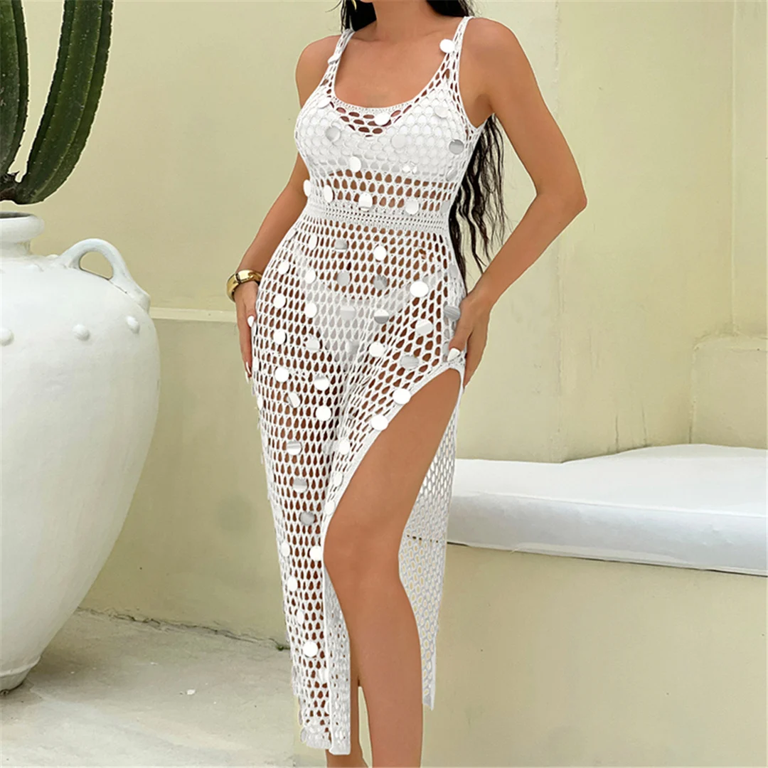 Shiny Sequins Hollow Out Crochet Knitted Tunic Beach Cover Up Cover-ups Beach Dress Mini Beach Wear Beachwear Female Women K6685