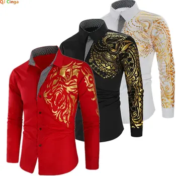 2023 men’s party casual shirt luxury social men’s shirt lapel button shirt casual plaid print gold long-sleeved shirt