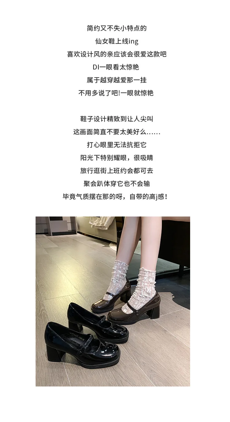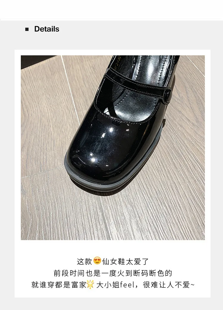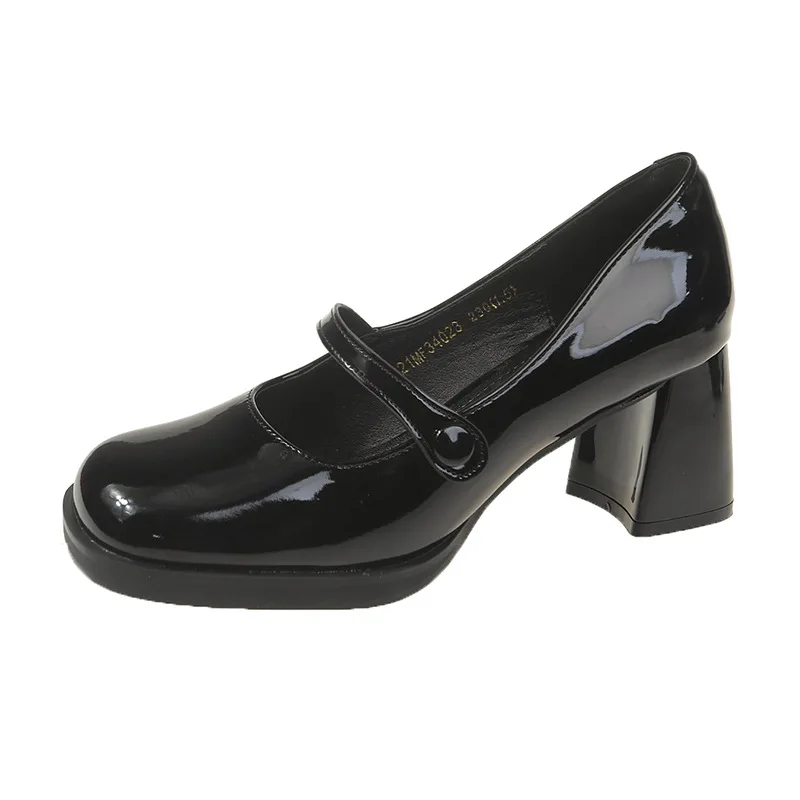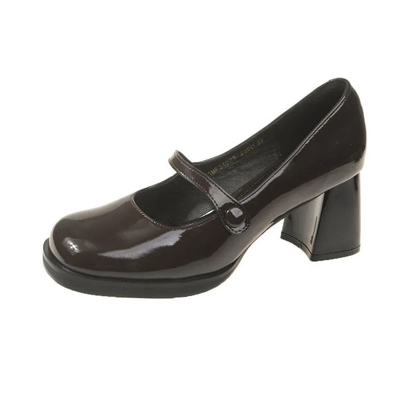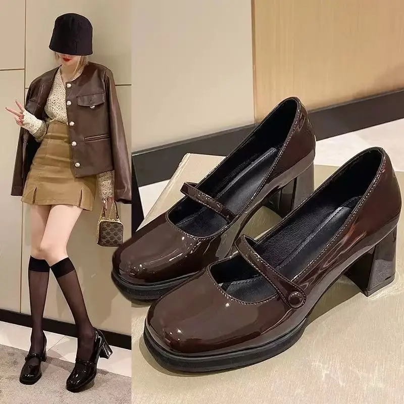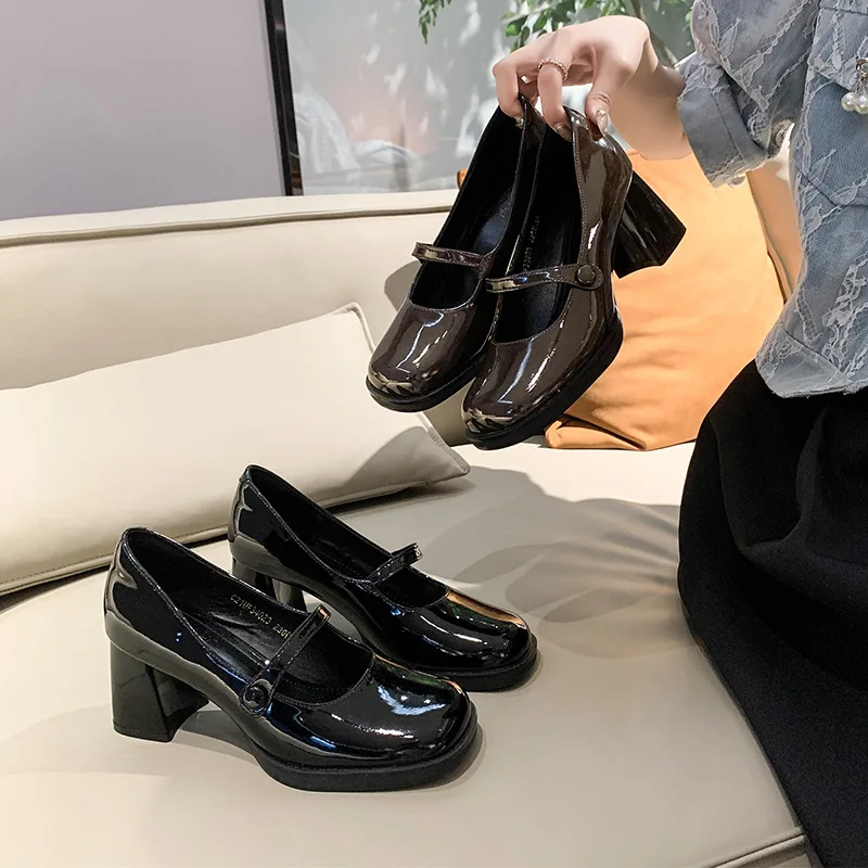 Spring New Patent Leather Brown Shoes Vintage Thick High Heels Mary Jane Shoes Women Woman Square Toe Chunky Heels Pumps Mujer