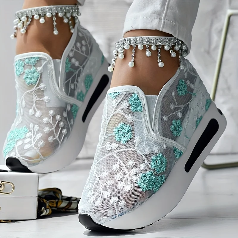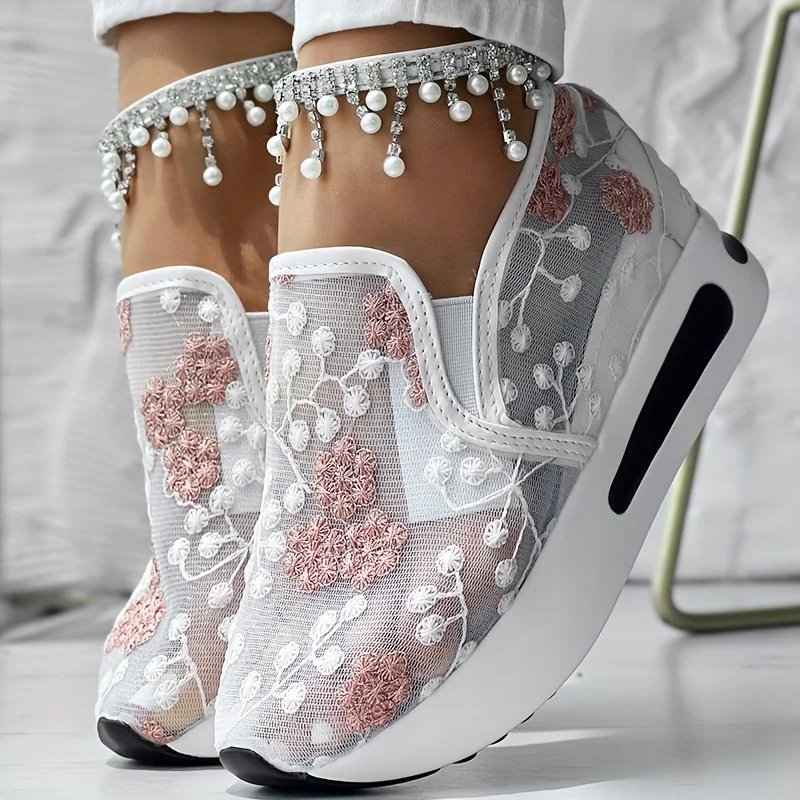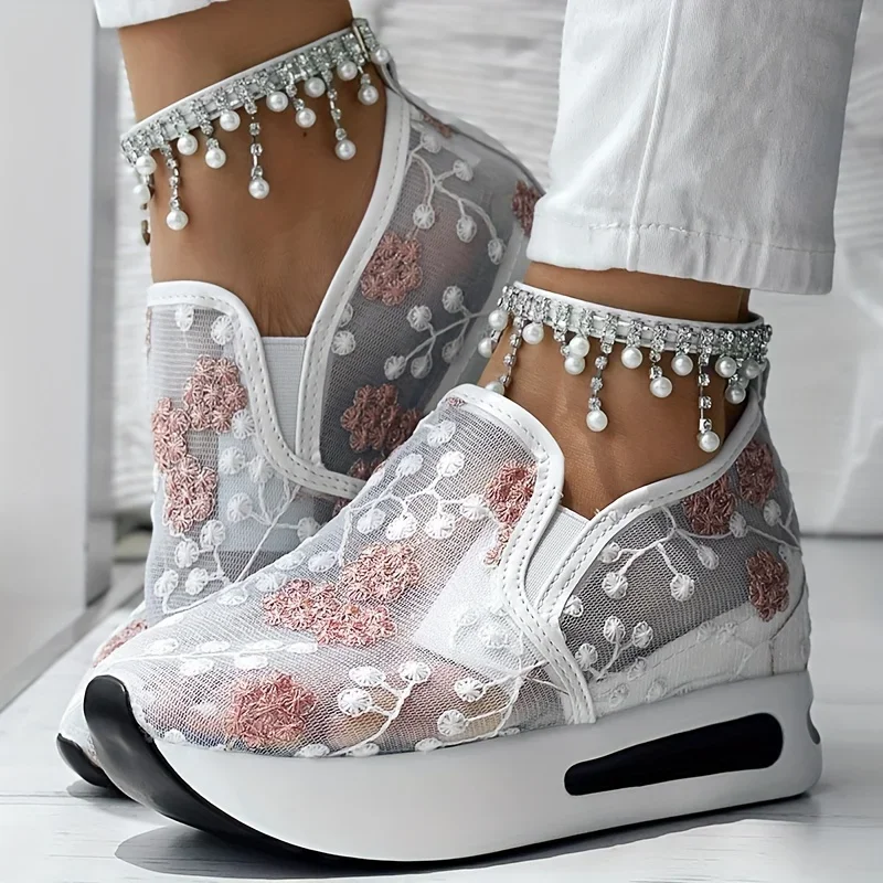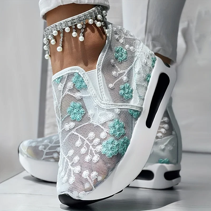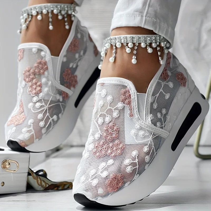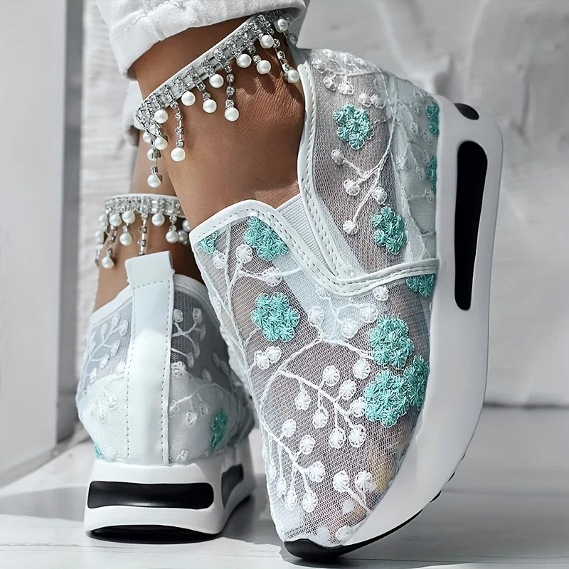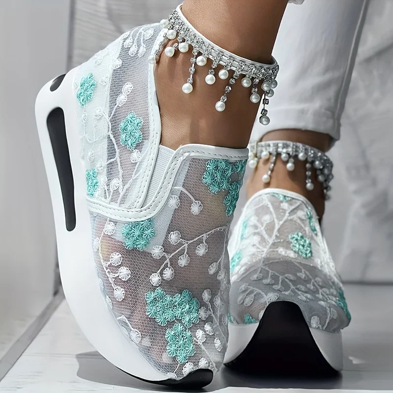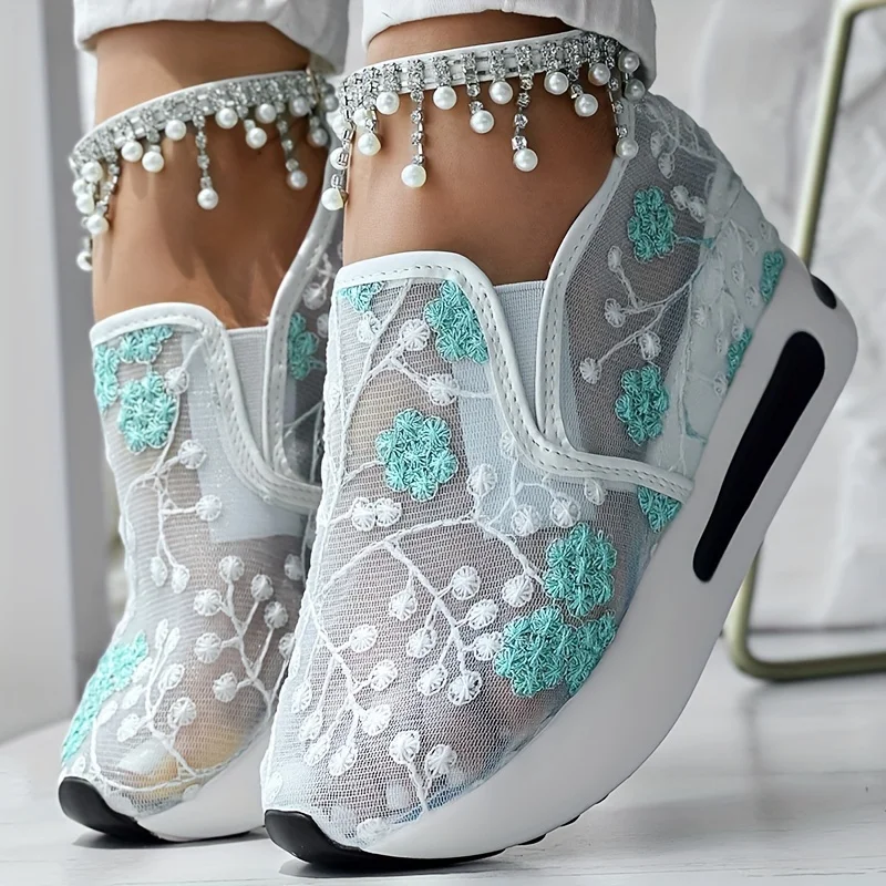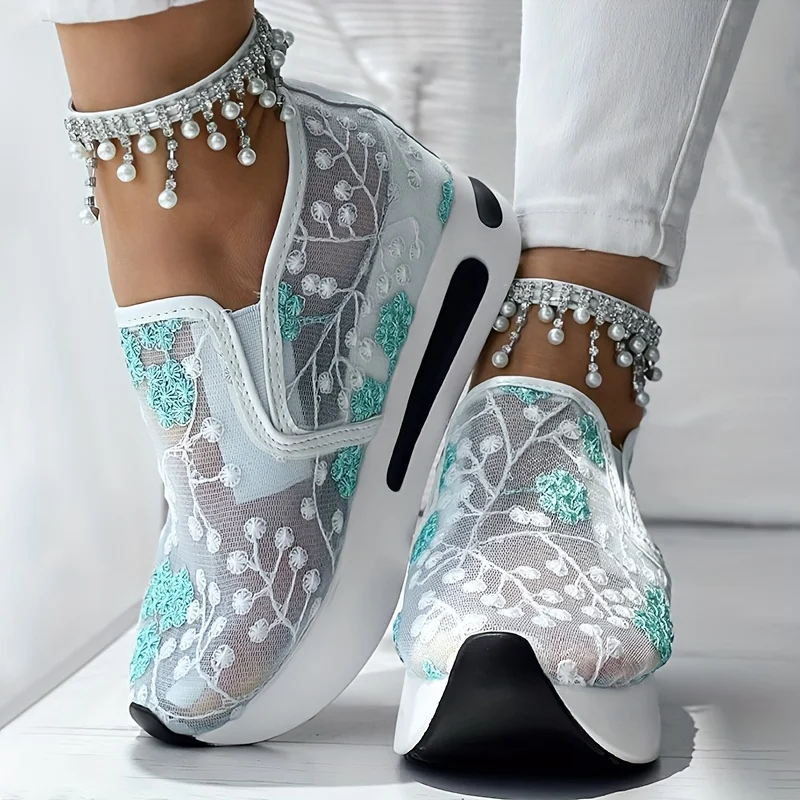 Stylish Floral Embroidery Mesh Sneakers – Breathable, Lightweight, and Comfortable Walking Shoes with Sheer Mesh Panels