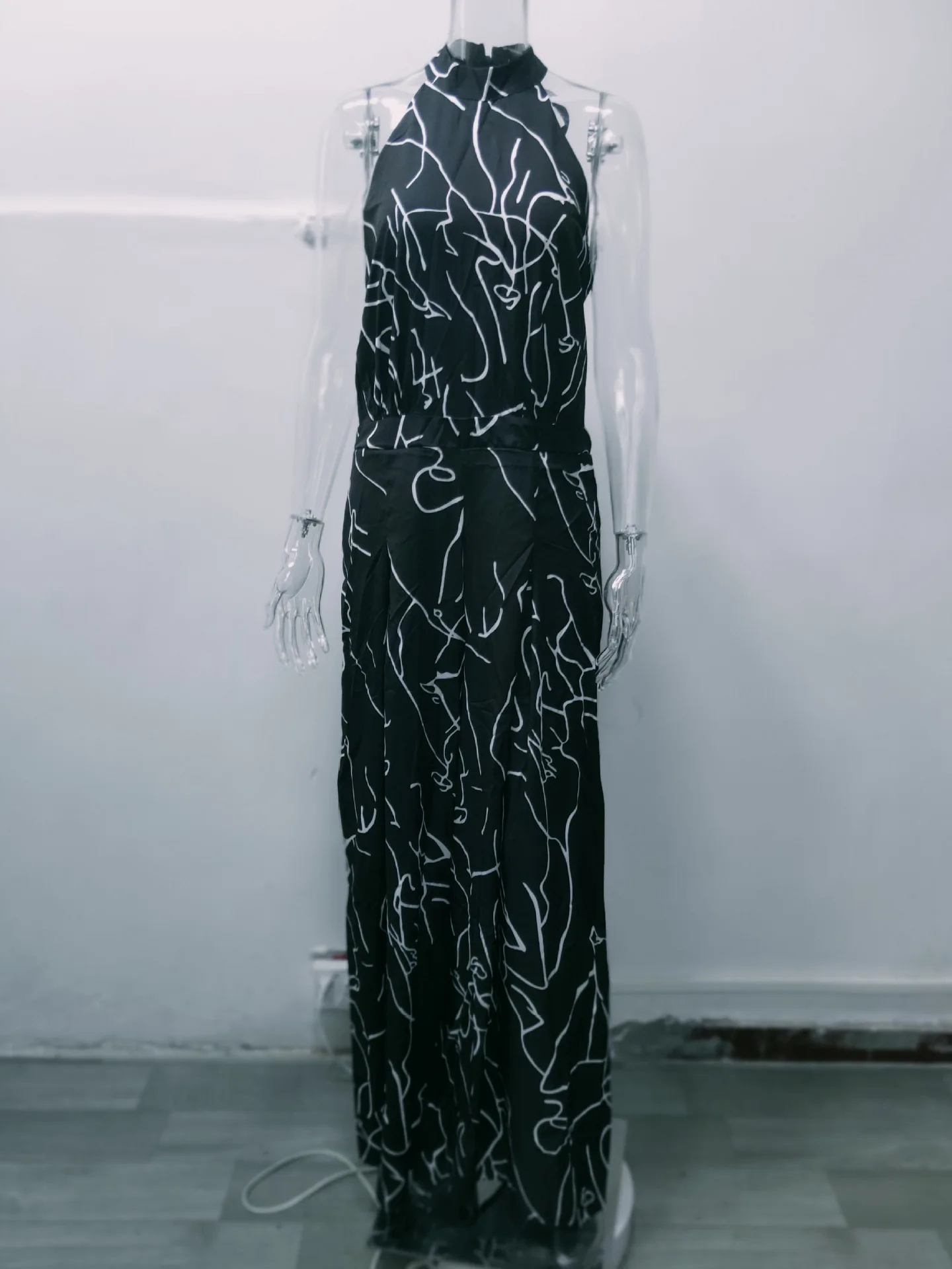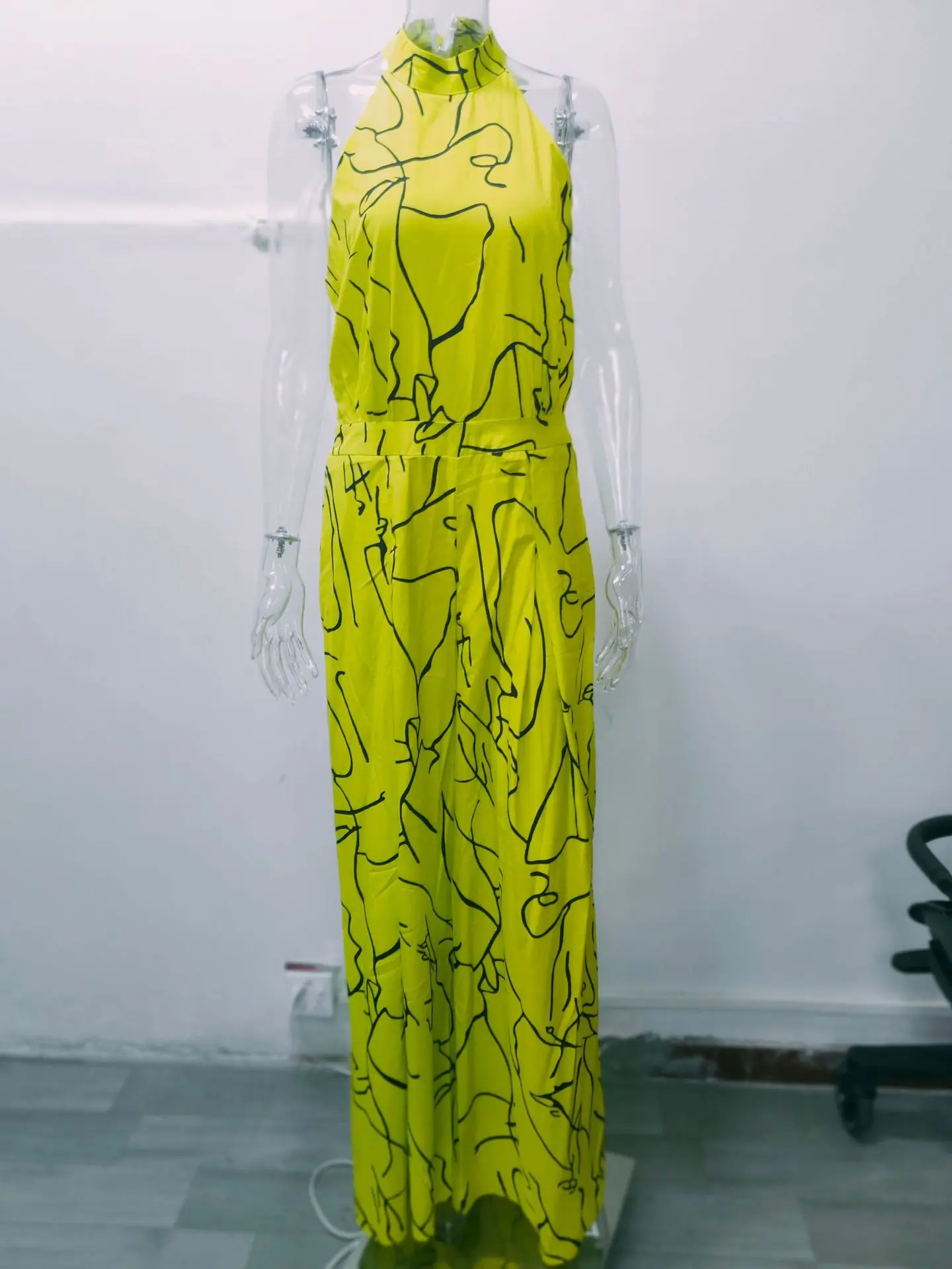 Summer European and American women’s wear with elegant waist-cinching sash-tie sleeveless off-shoulder long pants printed jumps